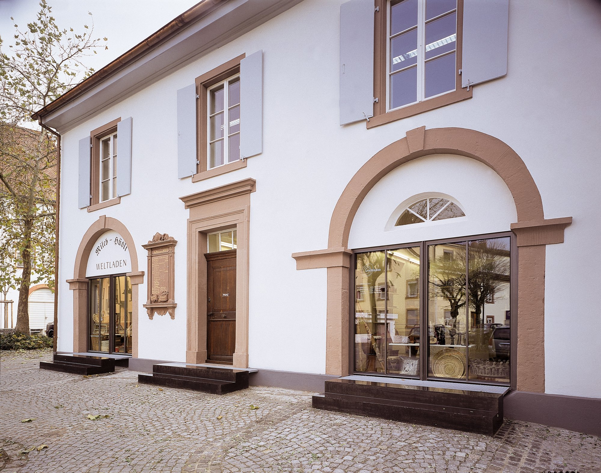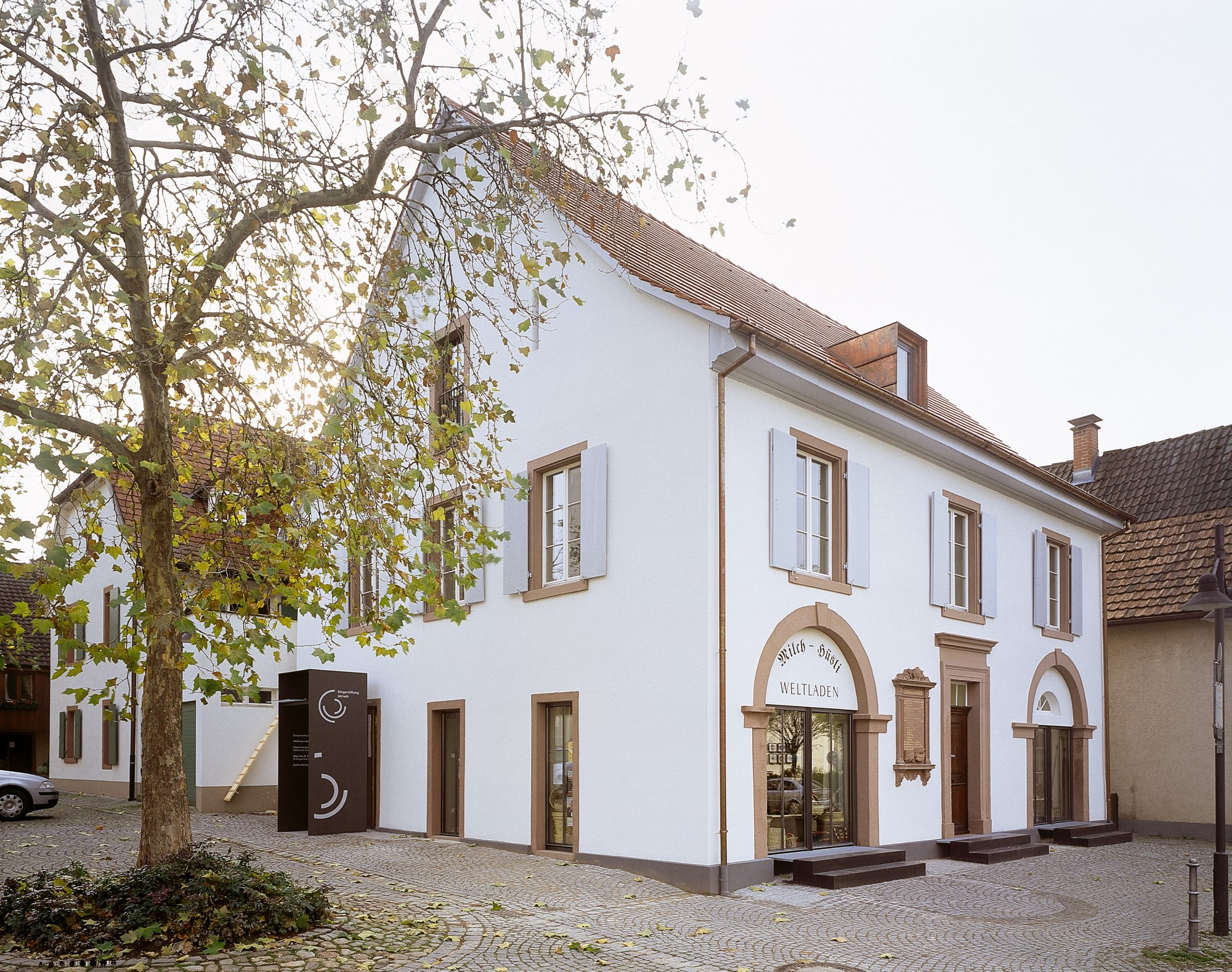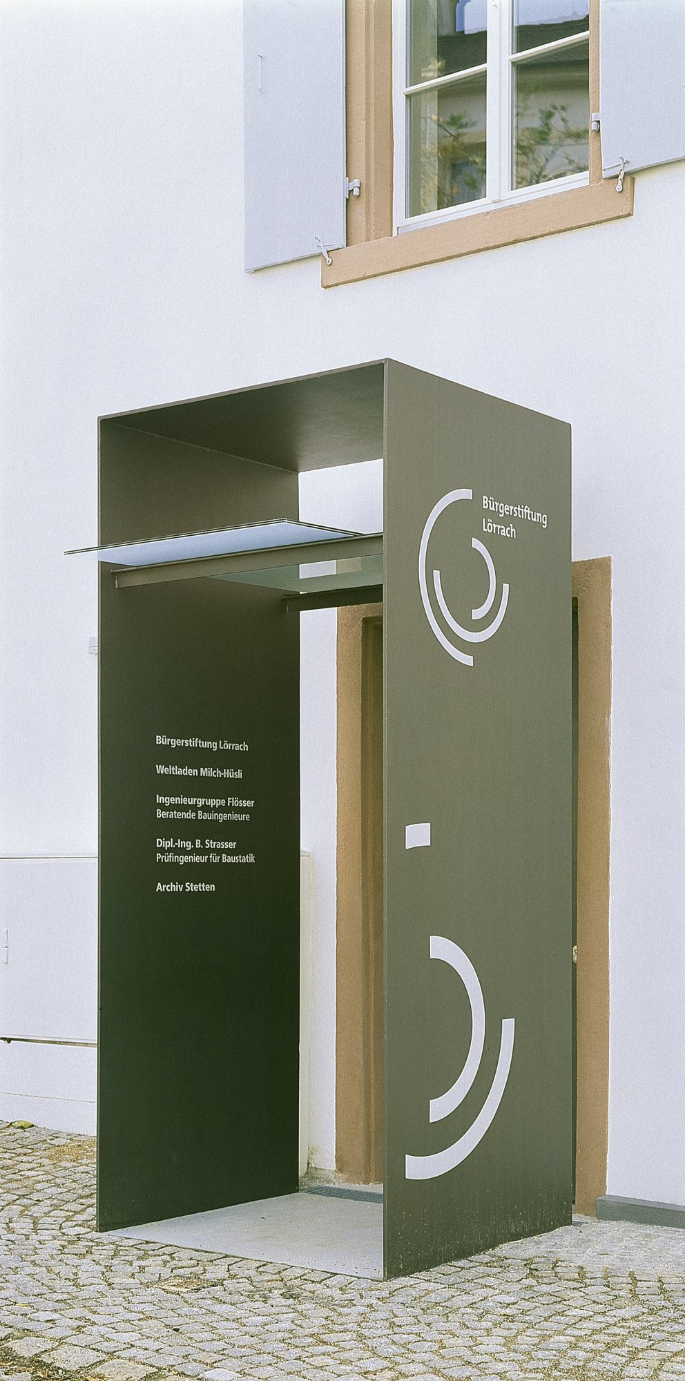 Das denkmalgeschützete Gebäude aus dem Jahr 1825 diente bis 1908 als Rathaus des Lörracher Ortsteils Stetten und ist seitdem mit wechselnden Nutzungen zunehmend verwahrlost. Als Sitz der neu gegründeten Bürgerstiftung Lörrach wurde es historisch saniert und für neue Nutzungen umgebaut. Im EG ist neben dem Büro der Stiftung ein Dritte-Welt-Laden untergebracht, im 1.OG vermietete Büroräume und im Dachgeschoss ein Archiv für die Stettener Vereine. Mit modernen architektonischen Elementen wird der historische Baukörper ergänzt und kontrastiert, so dass im Dialog von Alt und Neu der neuen Nutzung auch gestalterisch entsprochen wird. insbesondere grossflächige Verglasungen im Erdgeschoss, ein vorgelagerte Aussentreppe aus Betonfertigteilen und eine neue Kupfer gedeckte Dachgaube, schaffen einen neuen Bezug zwischen innen und aussen, ohne in die bestehende Bausubstanz einzugreifen.