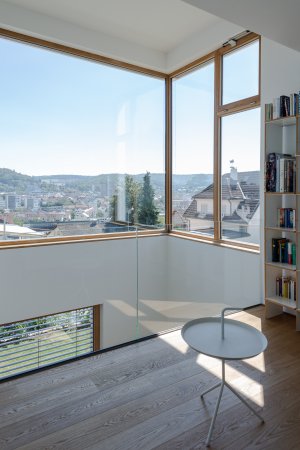 In einem bestehenden Wohngebiet wird durch das freistehende EFH eine Nachverdichtung realisiert, die einen eigenständigen und markanten städtebaulichen Akzent setzt. Zwei Überhöhungen, beim Treppenhaus an der einen Gebäudeecke und dem Wohn- bzw. Luftraum an der gegenüberliegenden Gebäudeecke, setzen nicht nur Hochpunkte im Strassenraum, sondern auch räumliche Höhepunkte im Innern. Zwischen den zweigeschossigen Räumen spannen sich die Nutzungen der Wohngeschosse auf. Ein- und Ausblicke werden gezielt auf die städtebauliche Situation ermöglicht oder unterbunden.