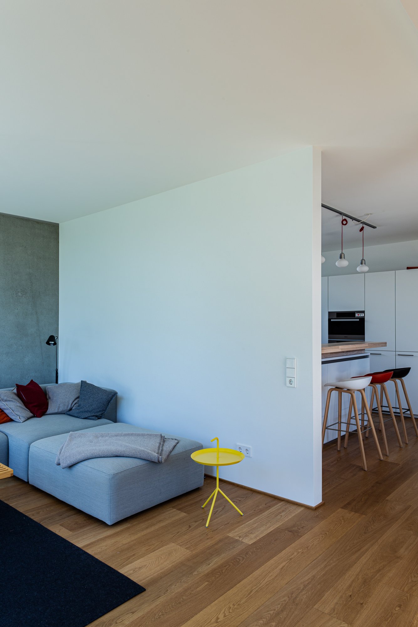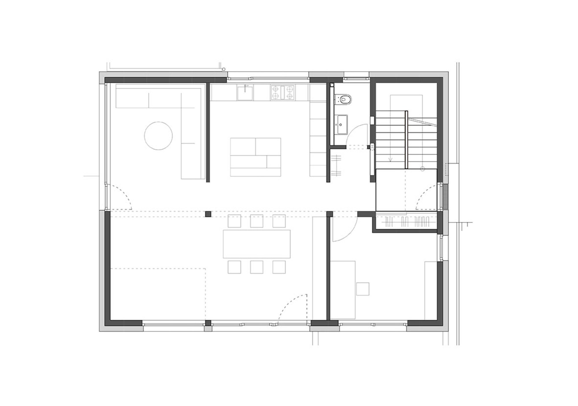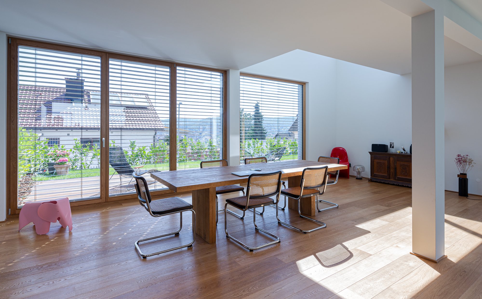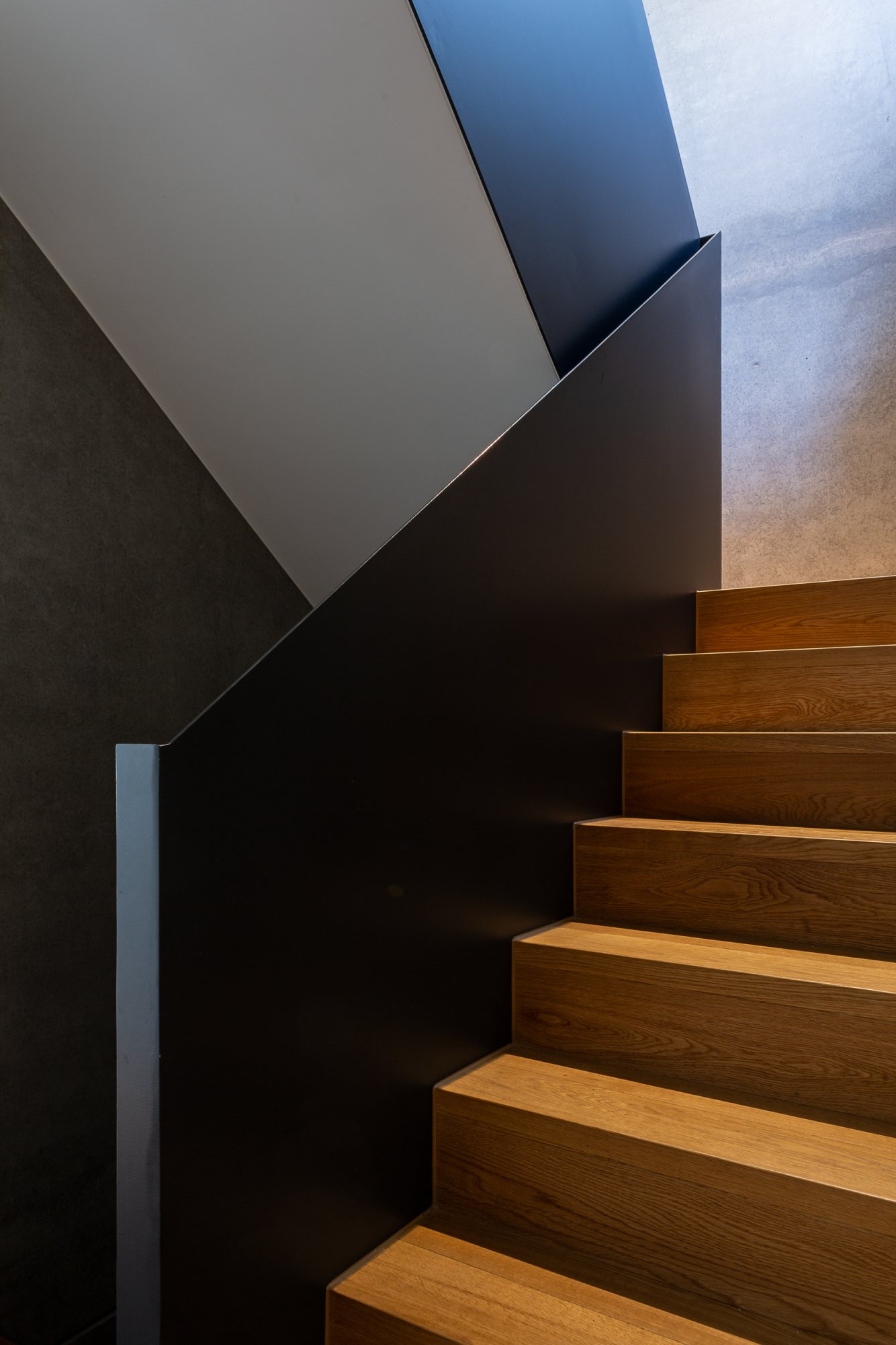 In einem bestehenden Wohngebiet wird durch das freistehende EFH eine Nachverdichtung realisiert, die einen eigenständigen und markanten städtebaulichen Akzent setzt. Zwei Überhöhungen, beim Treppenhaus an der einen Gebäudeecke und dem Wohn- bzw. Luftraum an der gegenüberliegenden Gebäudeecke, setzen nicht nur Hochpunkte im Strassenraum, sondern auch räumliche Höhepunkte im Innern. Zwischen den zweigeschossigen Räumen spannen sich die Nutzungen der Wohngeschosse auf. Ein- und Ausblicke werden gezielt auf die städtebauliche Situation ermöglicht oder unterbunden.
