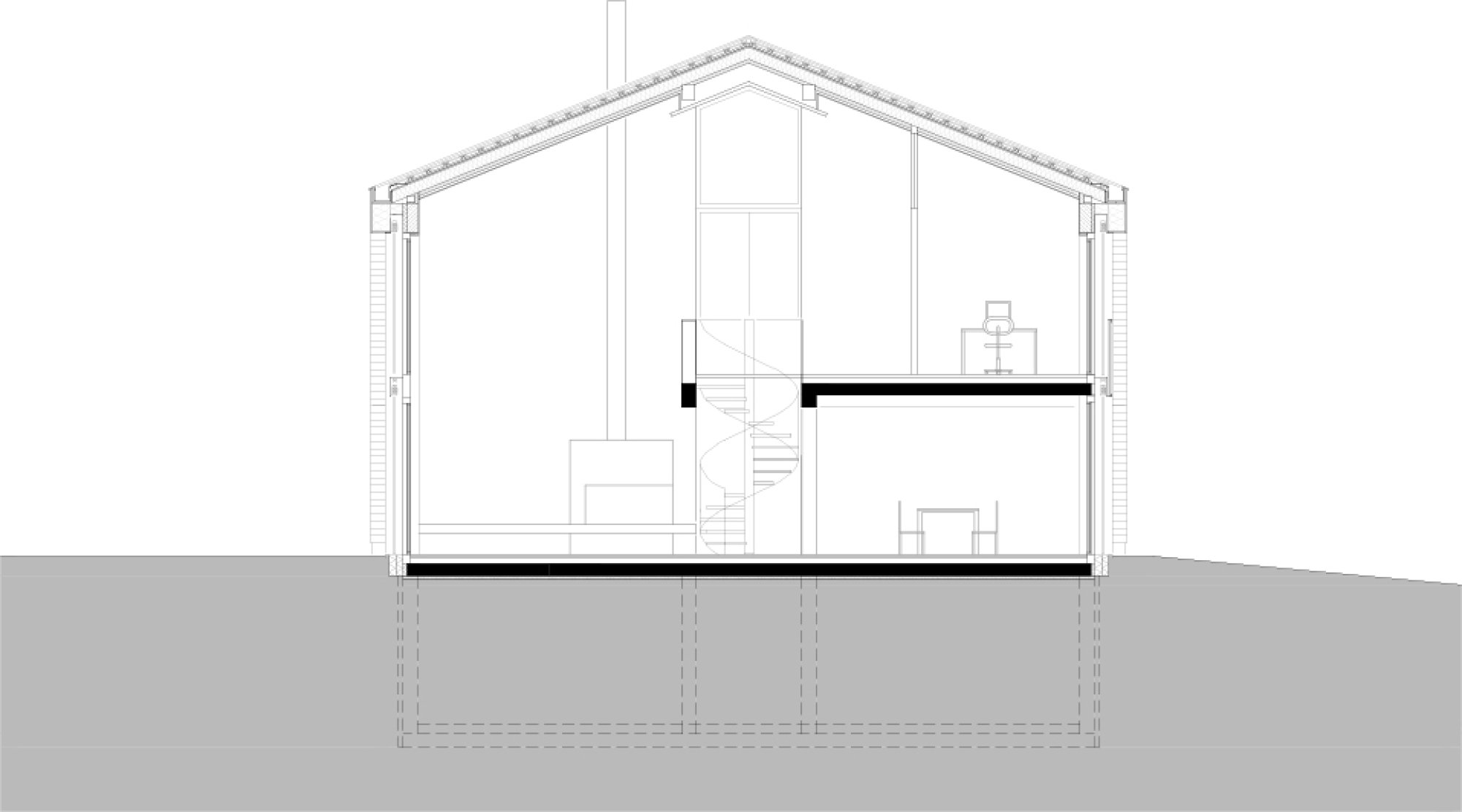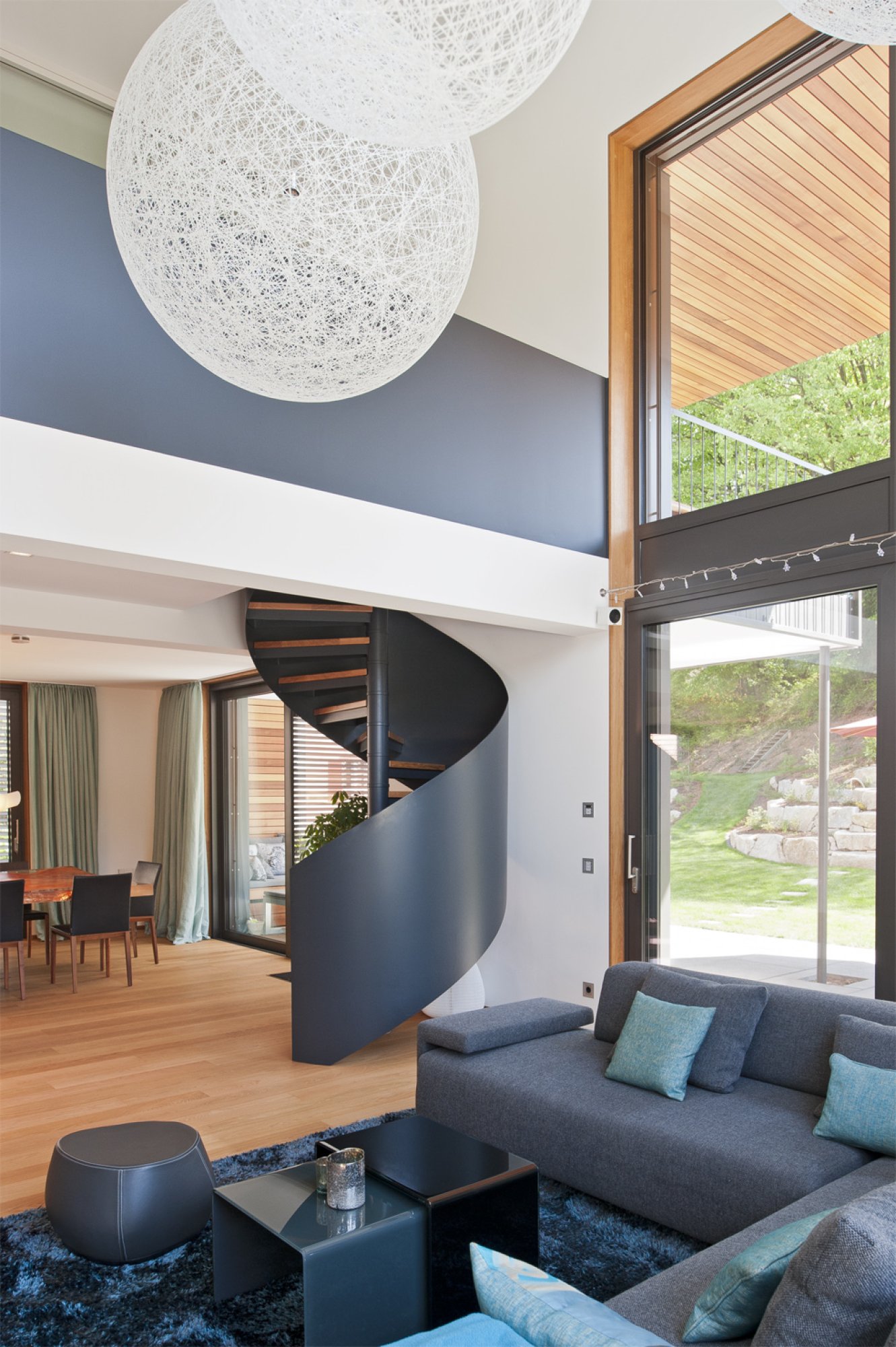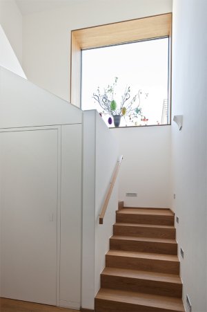 Dieses Haus soll sich durch seine ruhige, aber moderne Satteldachform in die Dorfstruktur einfügen. Es ist ein großzügiges Haus mit Passivhausstandard (Geothermie-Heizung) und nobler Innenausstattung nach Architektenentwürfen entstanden. Die von der Bauherrenschaft gewünschte Holzfassade spielt zwischen horizontaler Red-Cedar Schalung und vertikalen Rautenbrettern.