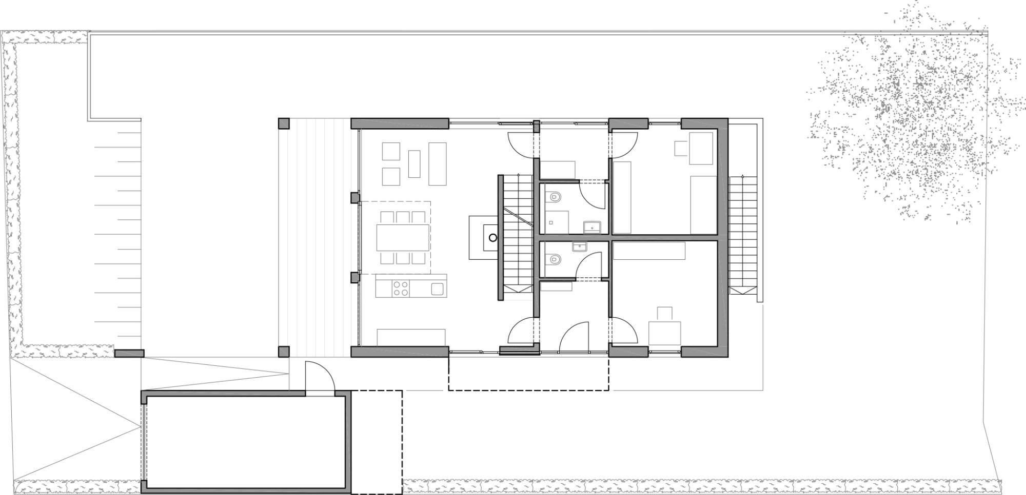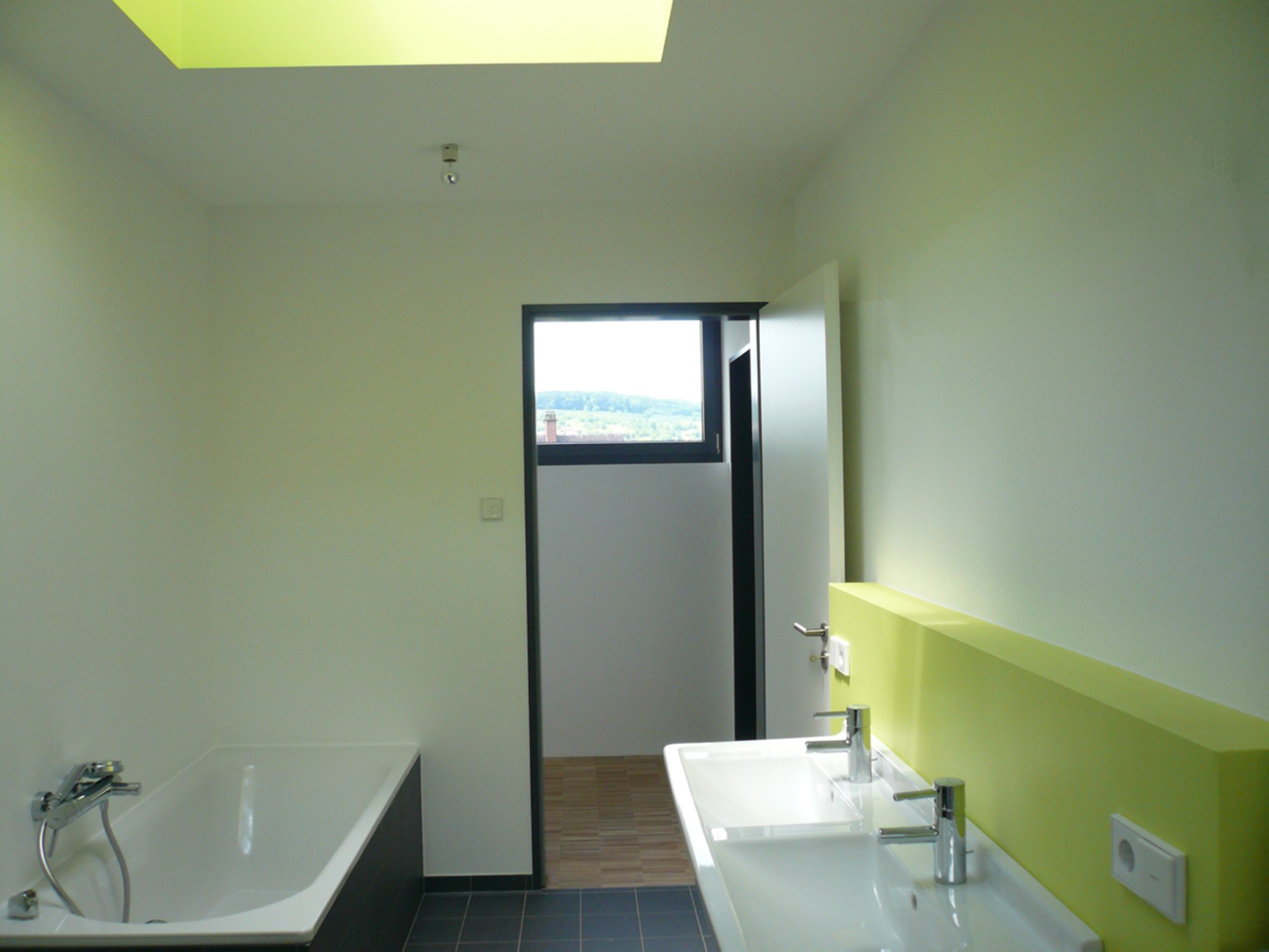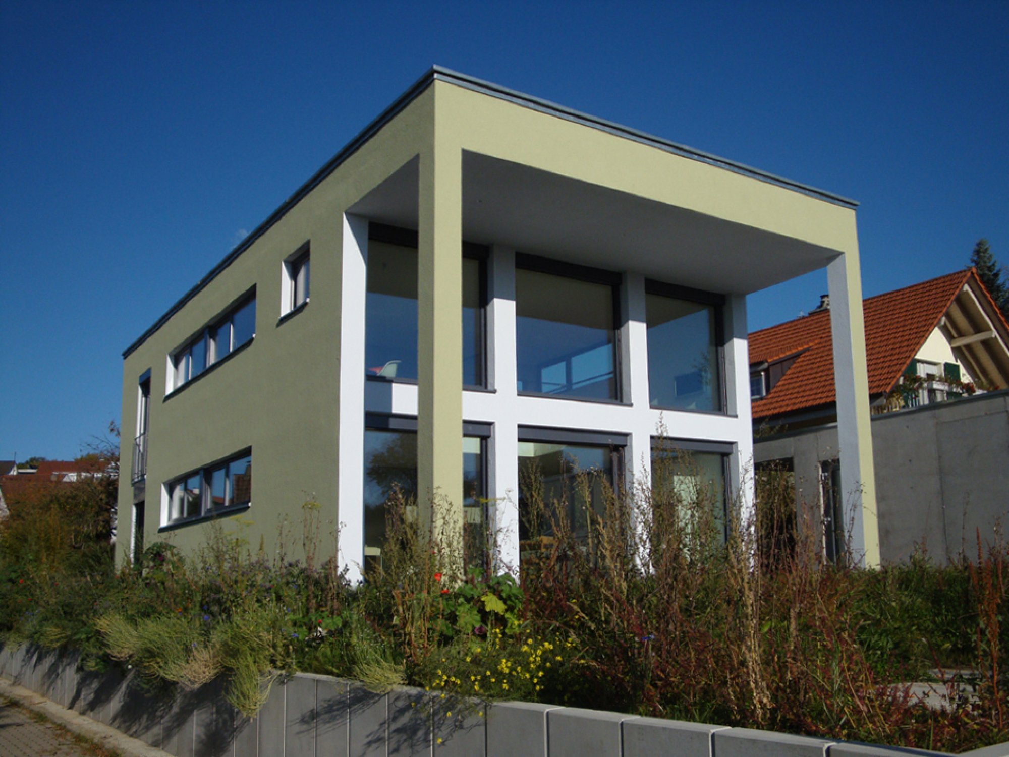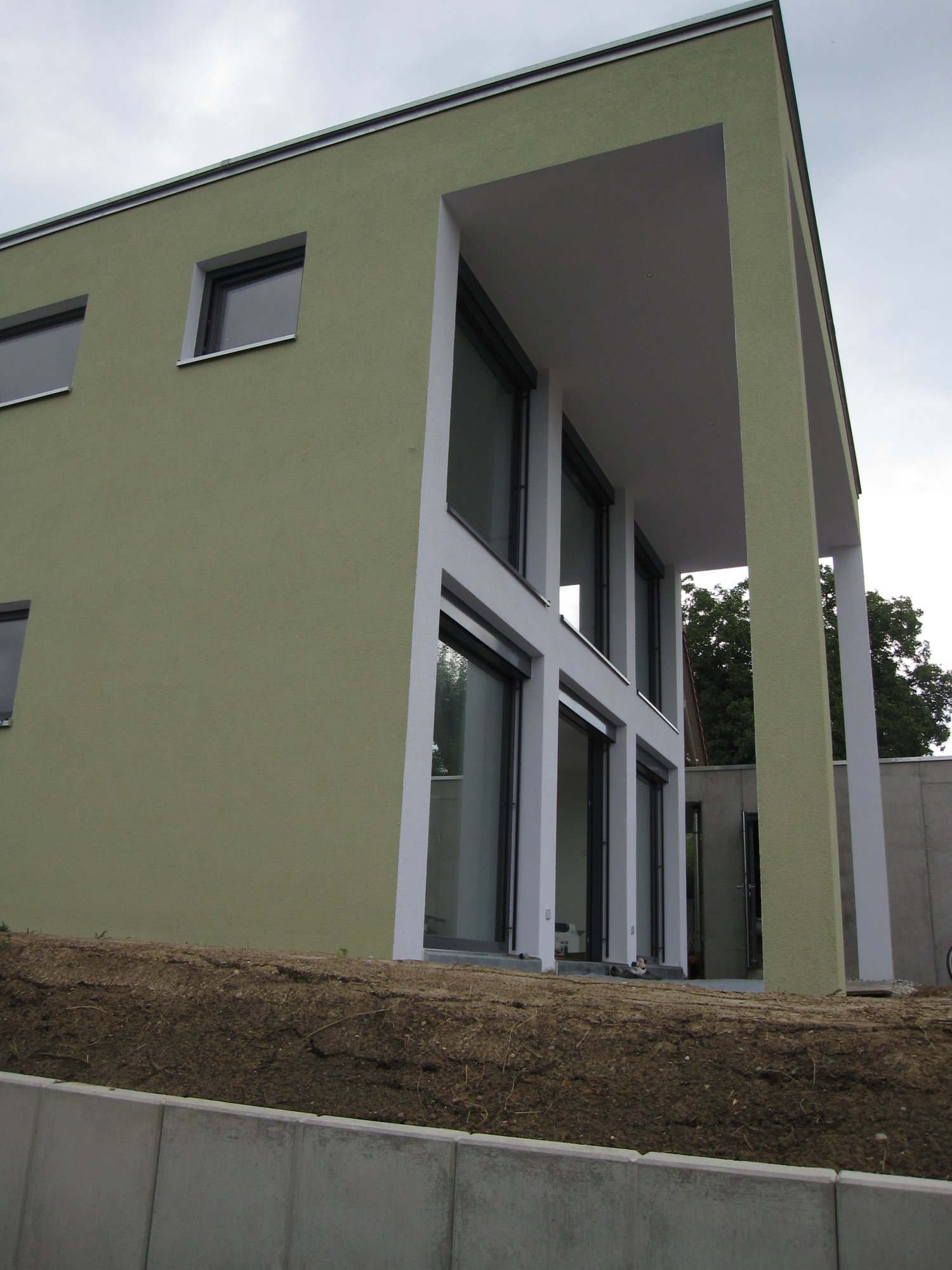 Das Einfamilienhaus für eine junge Familie ist nach Süden orientiert, im Norden komplett geschlossen, im Osten und Westen, mit Band-oder Lochfenstern versehen. Dies ergibt beste ökologische Werte. Das Haus hat 176 qm Wohnfläche, ist voll unterkellert und wurde inkl. Garage für 310.000 Euro realisiert.