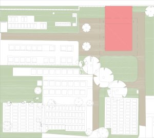 Die nach Osten orientierte Einsegnungshalle ist ein autonomer Baukörper und soll einen ruhigen Pol mit eigenem Charakter im Friedhofsareal bilden.