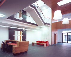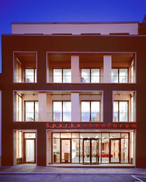 Die geschlossene Strassenrandbebauung im Westen wird aufgenommen. Ein neues, 3-geschossiges Gebäude mit Attikageschoss schliesst bündig an den vorhandenen Hauptbau an. In der Binnenzone wird über der bestehenden Tiefgarage ein 4-geschossiger stützenfreier Stahlbau als Büro- und Beratungstrakt erstellt. Dieser gläserne Bau ist frei einteilbar und als eine Art Brückenkonstruktion mit 2 Kernen entwickelt worden. Der Zwischenbereich bildet eine 2-geschossige Halle, das Sparkassenforum, welches die Kunden von beiden Seiten empfängt und u.a. Raum für Veranstaltungen bietet. Der Bürobau besteht aus einer hinterlüfteten Fassade aus bedrucktem Weissglas und Eichenholzfenstern. Das Flachdach wurde mit 120 Voltaikmodulen mit 19,4 kW bestückt. Die Heiz-/ Kühldecke erlaubt hohe Flexibilität, da Fussböden und Fassaden frei von Heizinstallationen sind.