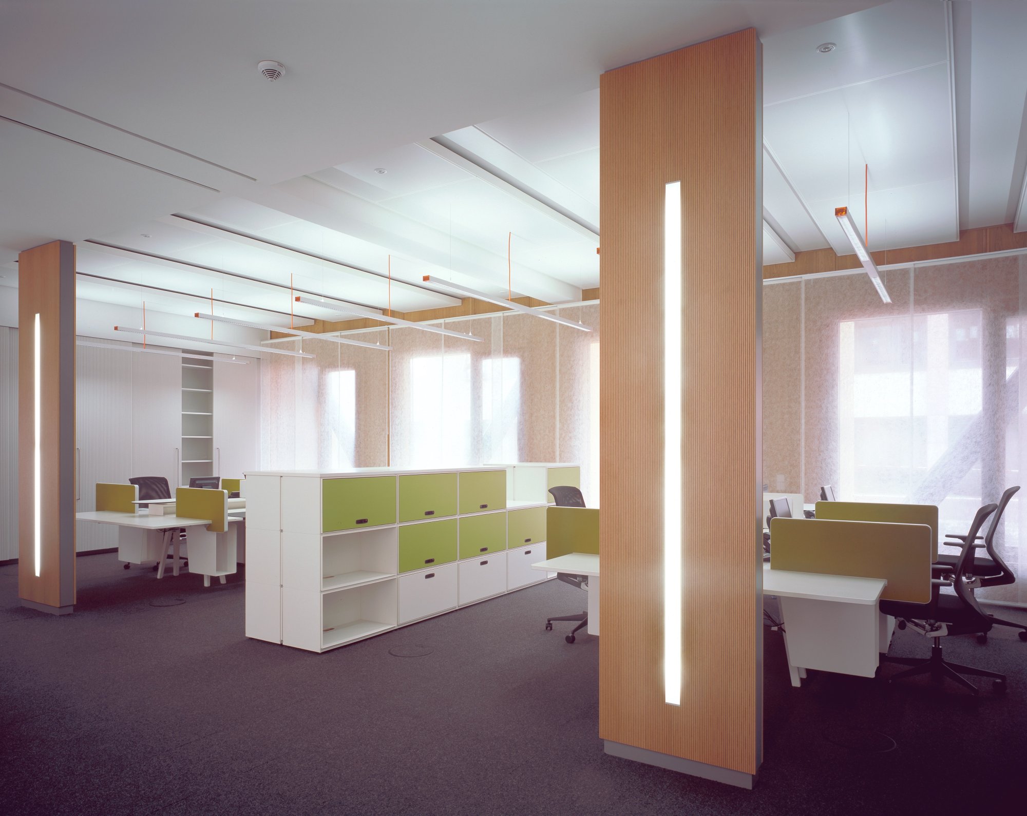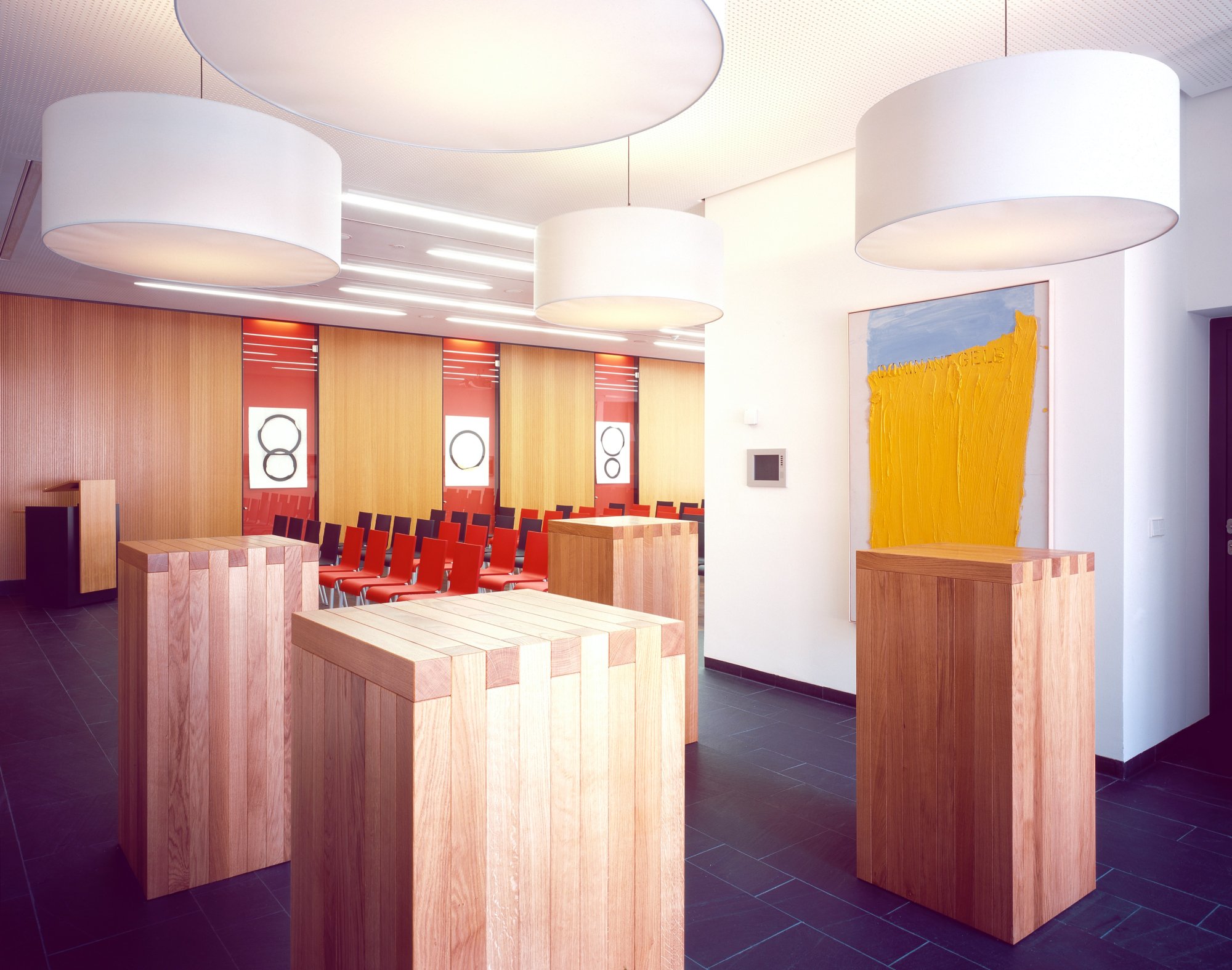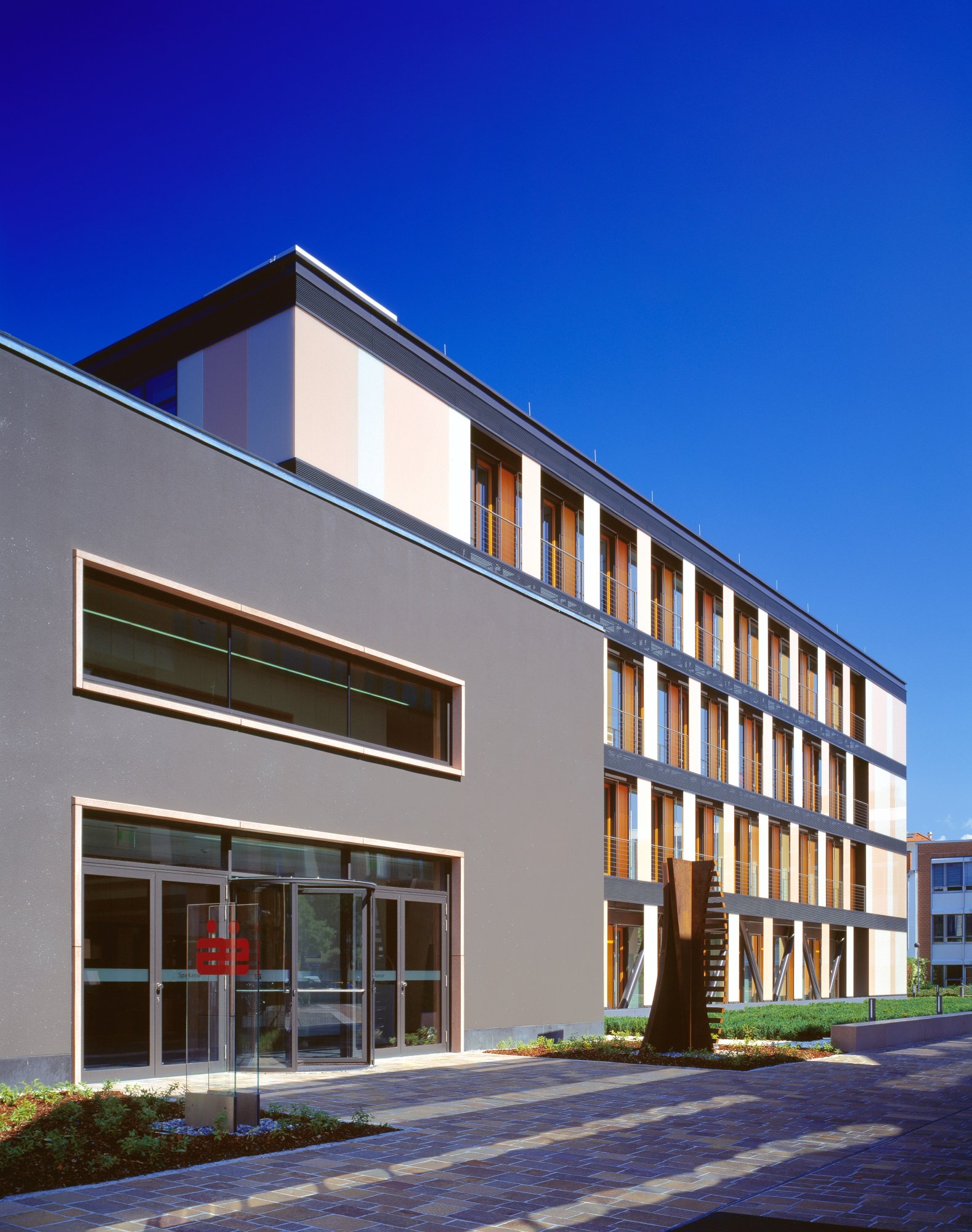 Die geschlossene Strassenrandbebauung im Westen wird aufgenommen. Ein neues, 3-geschossiges Gebäude mit Attikageschoss schliesst bündig an den vorhandenen Hauptbau an. In der Binnenzone wird über der bestehenden Tiefgarage ein 4-geschossiger stützenfreier Stahlbau als Büro- und Beratungstrakt erstellt. Dieser gläserne Bau ist frei einteilbar und als eine Art Brückenkonstruktion mit 2 Kernen entwickelt worden. Der Zwischenbereich bildet eine 2-geschossige Halle, das Sparkassenforum, welches die Kunden von beiden Seiten empfängt und u.a. Raum für Veranstaltungen bietet. Der Bürobau besteht aus einer hinterlüfteten Fassade aus bedrucktem Weissglas und Eichenholzfenstern. Das Flachdach wurde mit 120 Voltaikmodulen mit 19,4 kW bestückt. Die Heiz-/ Kühldecke erlaubt hohe Flexibilität, da Fussböden und Fassaden frei von Heizinstallationen sind.