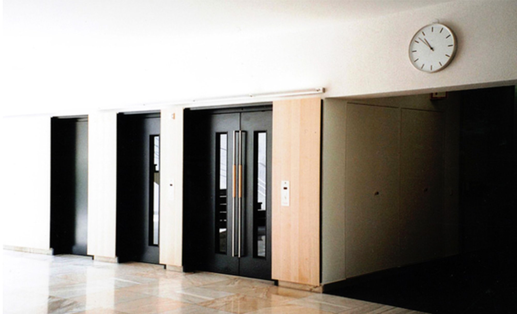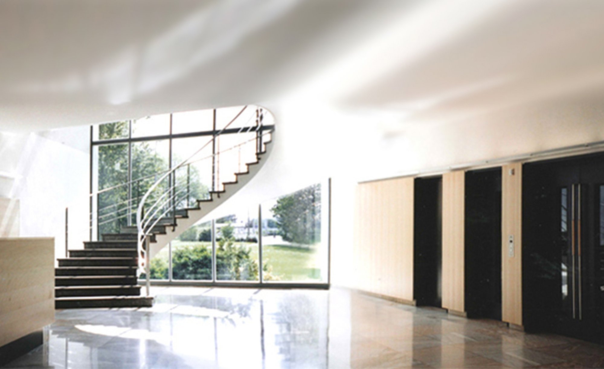 Eine Empfangstheke mit schallschluckender Verkleidung und Präsentationsfläche wurde seitlich über Eck eingestellt. Gegenüberliegend wurde in gleicher Materialität die Aufzugsfront ebenfalls mit Akustikelementen verkleidet und einer die Decke anstrahlenden Beleuchtung versehen. Der Raum wird zur grosszügigen,akustisch angenehmen Empfangshalle unter Bewahrung ihres ursprünglichen Charakters.