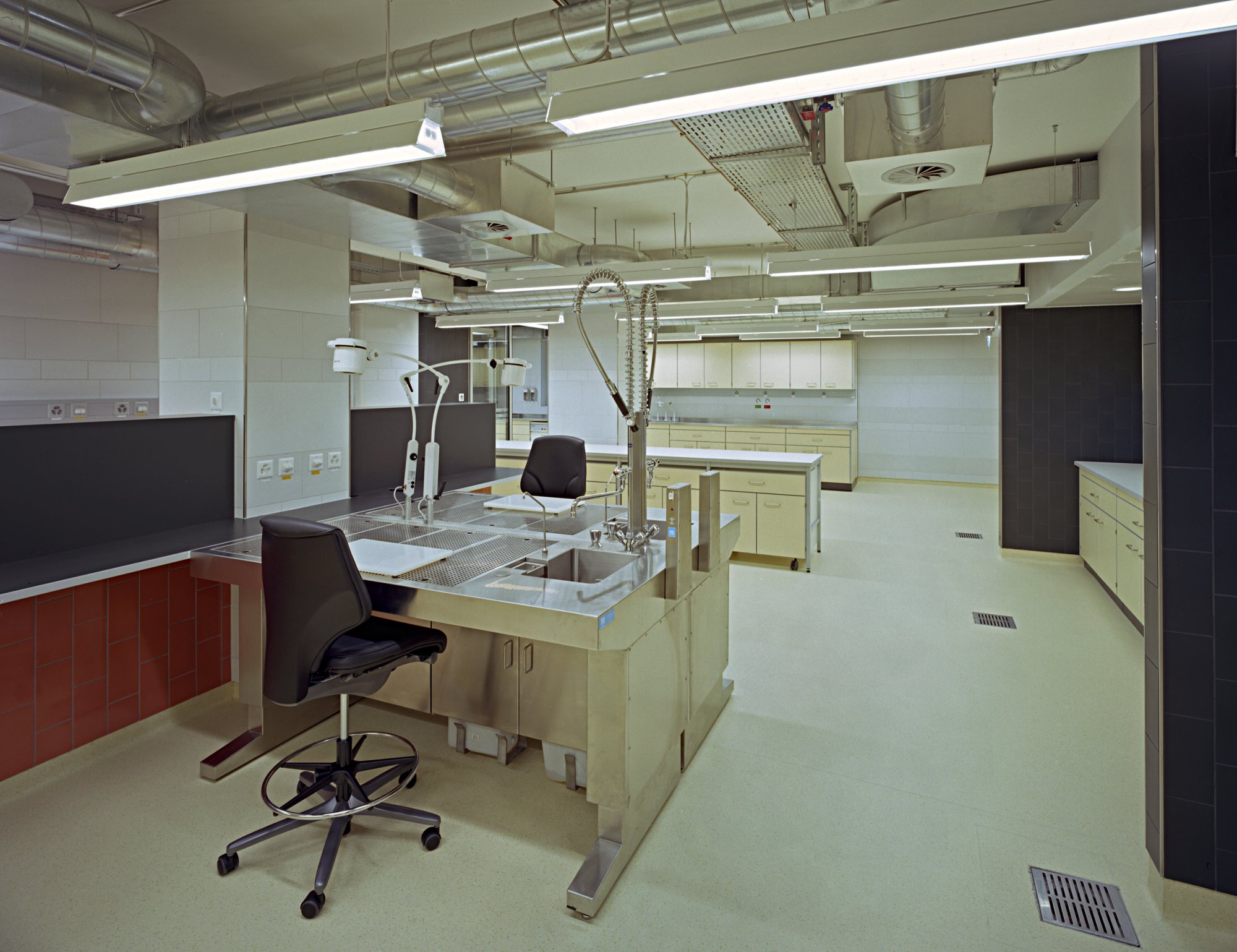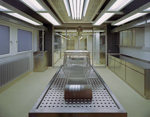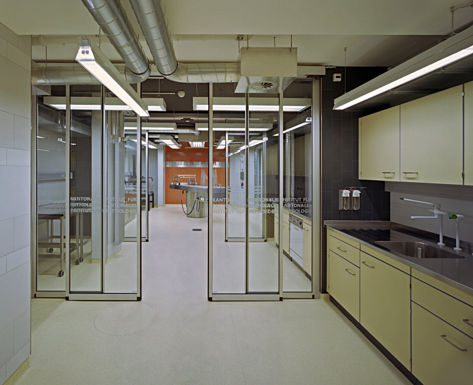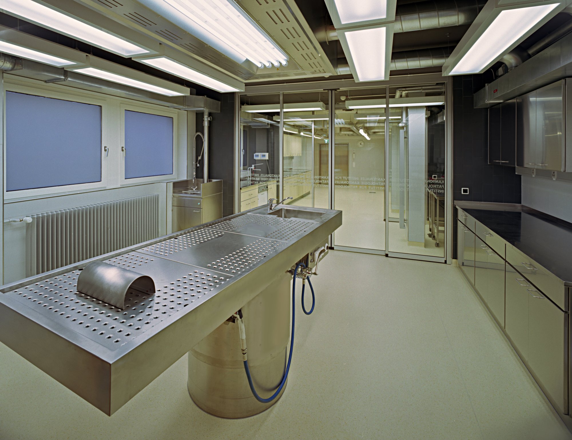 Der Umbau und die Sanierung des Bereichs Pathologie, Seziersaal, des Kantonsspital Liestal / CH stellt einen grundlegenden Rückbau der Räumlichkeiten aus den 60er Jahren dar. Eine vollständige Neuausbildung der Räume inklusive Laboreinrichtung führt zu optimalen Arbeitsabläufen mit sauberer Trennung von Labor- und Bürotätigkeiten, einschliesslich zusätzlicher Neugestaltung des Sanitärbereichs, bzw. der dazugehörigen Garderoben. Die Einrichtung mit komplett erneuerten haustechnischen Anlagen stellt hervorragende Arbeitsbedingungen her, bei denen durch einen neuen Seziertisch und zeitgemässe Sicherheitswerkbänke mit Abzugsanlagen die Gesundheitssicherheit der Mitarbeiter gewährleistet ist. Hier ist die Ausbildung von verschiedenen Druckzonen, bzw. – schleusen als wesentliche Massnahme zu erwähnen. Die Gestaltung der Einrichtung im Seziersaal in Edelstahl, einschliesslich des rundum höhenverstellbaren und drehbaren Seziertisches, schafft beste hygienische und ergonomische Arbeitsgrundlagen.