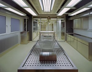 Der Umbau und die Sanierung des Bereichs Pathologie, Seziersaal des Kantonsspital Liestal / Schweiz stellt einen grundlegenden Rückbau der Räumlichkeiten aus den 60er Jahren dar. Eine vollständige Neuausbildung der Räume inklusive Laboreinrichtung führt zu optimalen Arbeitsabläufen mit sauberer Trennung von Labor- und Bürotätigkeiten, einschliesslich zusätzlicher Neugestaltung des Sanitärbereichs, bzw. der dazugehörigen Garderoben. Die Einrichtung mit komplett erneuerten haustechnischen Anlagen stellt hervorragende Arbeitsbedingungen her, bei denen durch einen neuen Seziertisch und zeitgemässe Sicherheitswerkbänke mit Abzugsanlagen die Gesundheitssicherheit der Mitarbeiter gewährleistet ist. Hier ist die Ausbildung von verschiedenen Druckzonen, bzw. -schleusen als wesentliche Massnahme zu erwähnen. Die Gestaltung der Einrichtung im Seziersaal in Edelstahl, einschliesslich des rundum höhenverstellbaren und drehbaren Seziertisches, schafft beste hygienische und ergonomische Arbeitsgrundlagen.