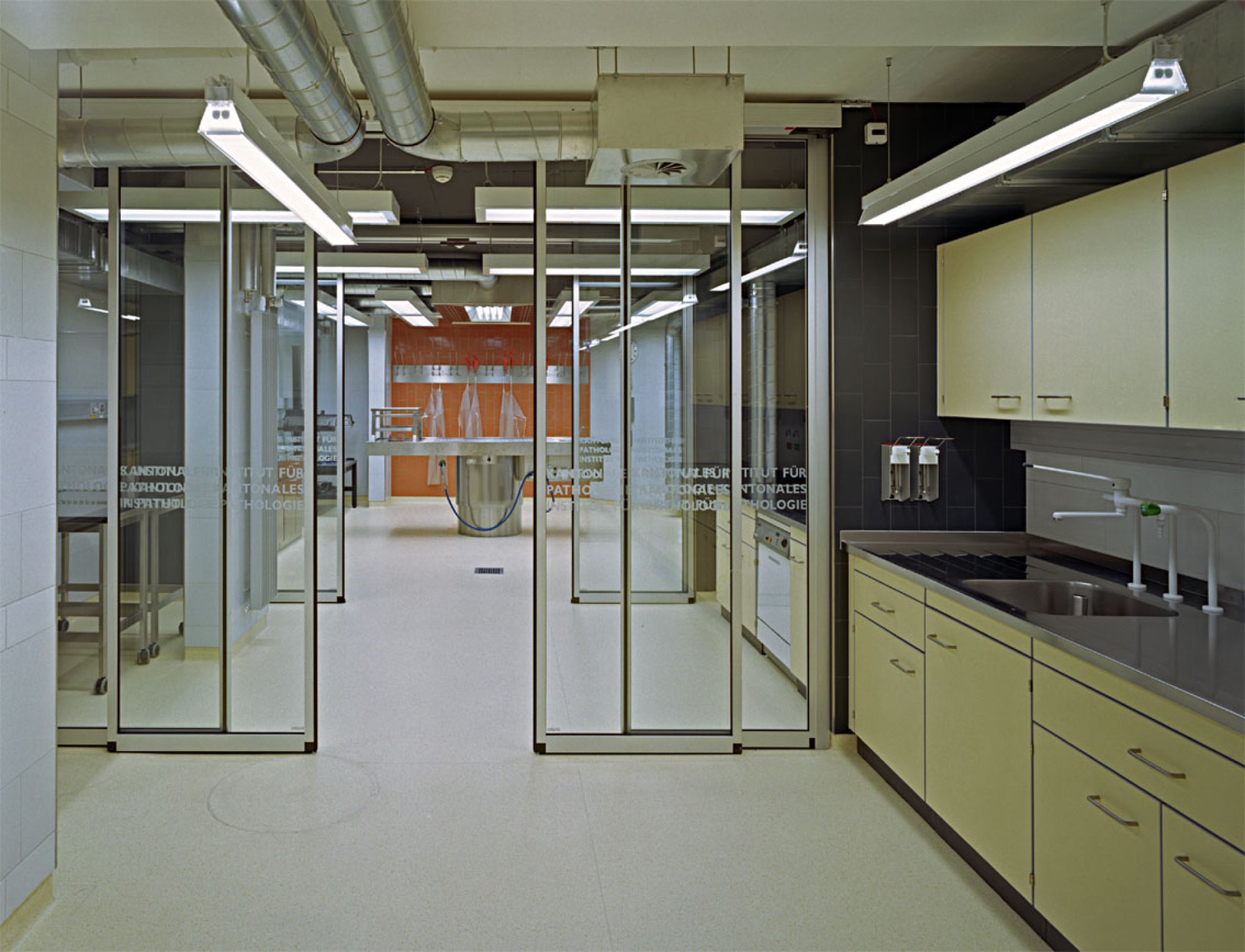 Der Umbau und die Sanierung des Bereichs Pathologie, Seziersaal des Kantonsspital Liestal / Schweiz stellt einen grundlegenden Rückbau der Räumlichkeiten aus den 60er Jahren dar. Eine vollständige Neuausbildung der Räume inklusive Laboreinrichtung führt zu optimalen Arbeitsabläufen mit sauberer Trennung von Labor- und Bürotätigkeiten, einschliesslich zusätzlicher Neugestaltung des Sanitärbereichs, bzw. der dazugehörigen Garderoben. Die Einrichtung mit komplett erneuerten haustechnischen Anlagen stellt hervorragende Arbeitsbedingungen her, bei denen durch einen neuen Seziertisch und zeitgemässe Sicherheitswerkbänke mit Abzugsanlagen die Gesundheitssicherheit der Mitarbeiter gewährleistet ist. Hier ist die Ausbildung von verschiedenen Druckzonen, bzw. -schleusen als wesentliche Massnahme zu erwähnen. Die Gestaltung der Einrichtung im Seziersaal in Edelstahl, einschliesslich des rundum höhenverstellbaren und drehbaren Seziertisches, schafft beste hygienische und ergonomische Arbeitsgrundlagen.