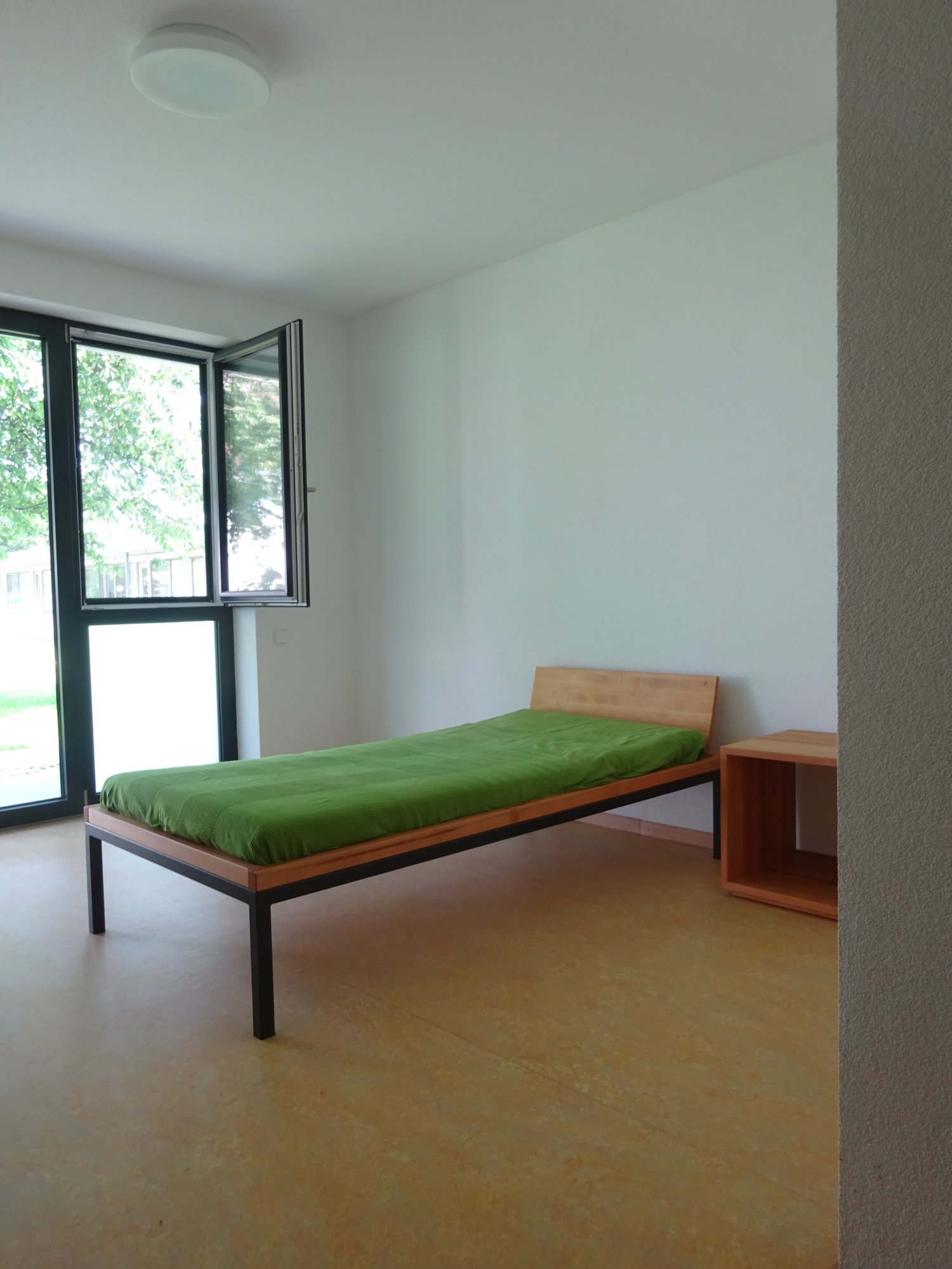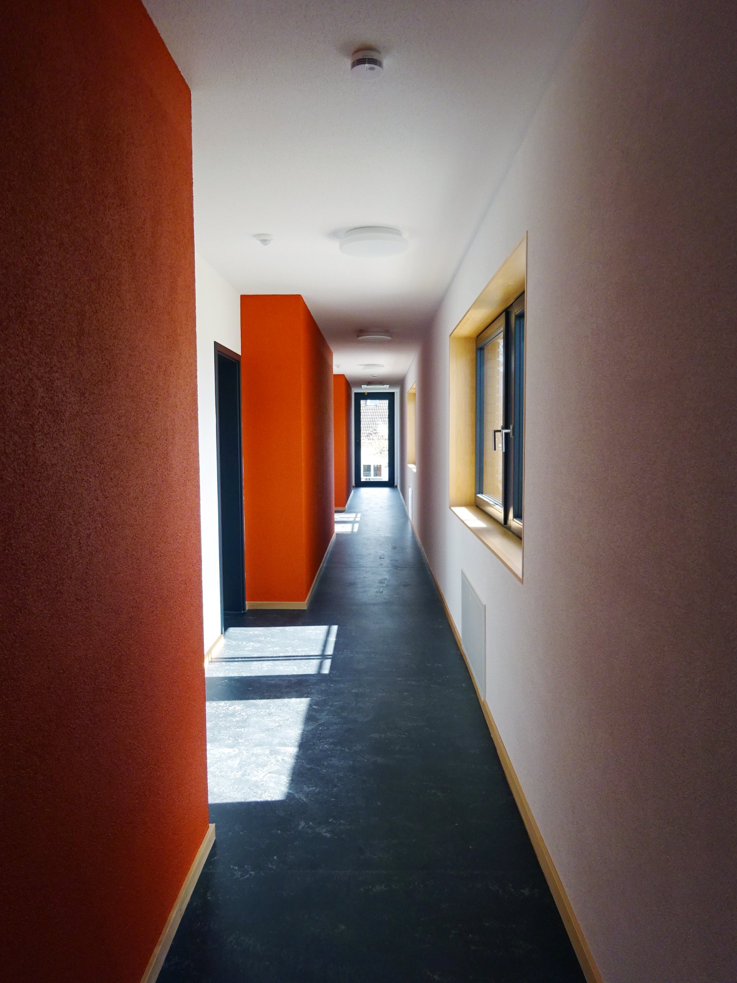 Ein zweigeschossiges Bettenhaus rundet den geschützten Freibereich des Therapiezentrums ab. Der Bau öffnet sich zu dem neuen Innenhof und den denkmalgeschützten Bauten des ehemaligen, historischen Post- und Bauernhofs. Die Architektur zeigt sich zeitgenössisch in Form und Gestalt und nimmt zugleich Materialien und Farben des Hofs und der dörflichen Umgebung auf. Putzfassaden und Terakottaelemente stehen in Bezug zum Bestand und runden diesen harmonisch ab. Die Zimmer des Bettenhauses öffnen sich grosszügig in den Grünhof und entwickeln Privatheit durch eine vorgelagerte Struktur aus Balkonen und Terrassen