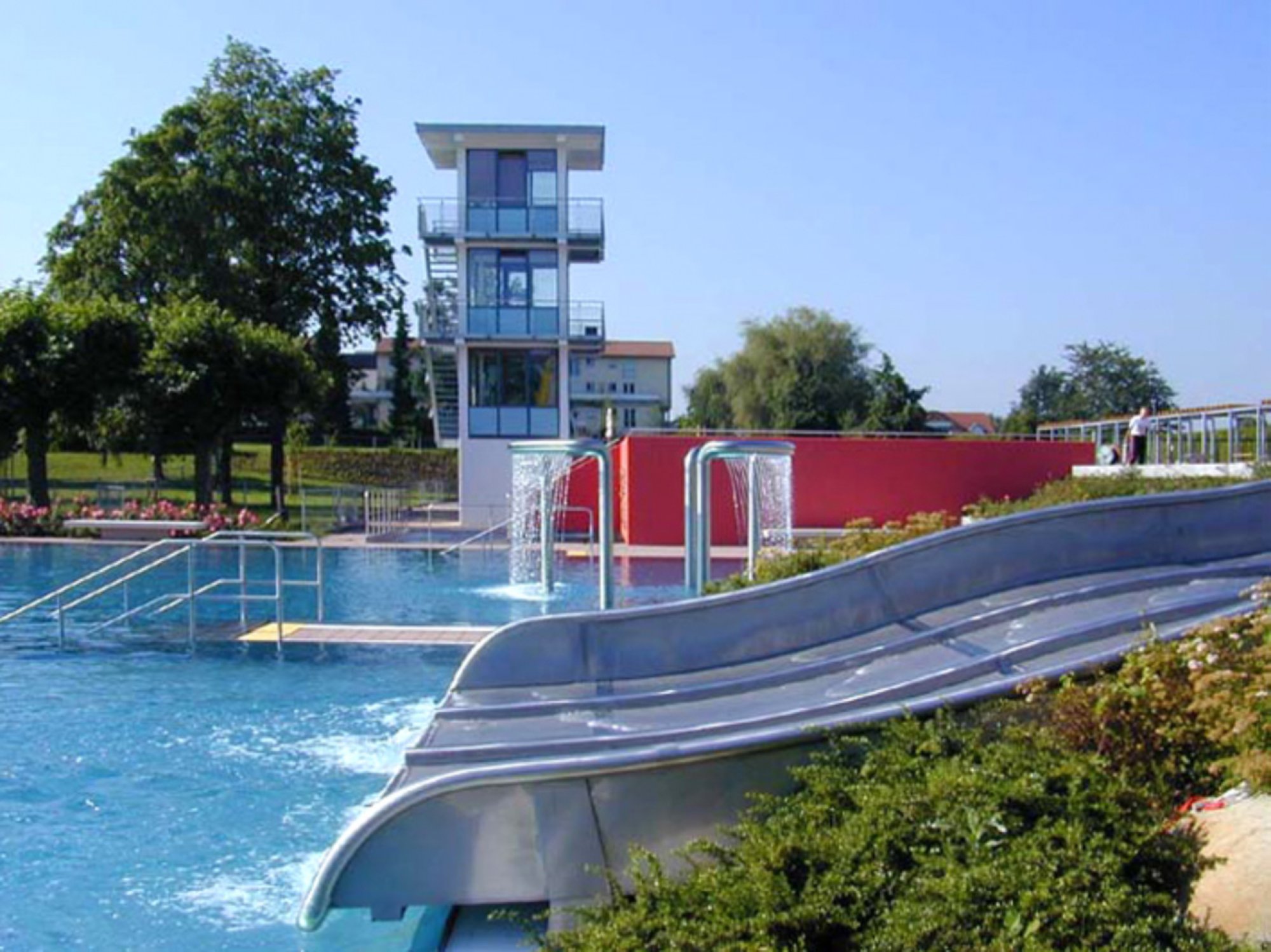 Die vorhandenen Geländeversprünge wurden ebenso in die Entwurfskonzeption übernommen wie die bestehenden Baumgruppen. Die gesamte Anlage besteht aus einem Eingangs- und Kiosk- und Umkleidegebäude, einem Erlebnisbecken und einem Eltern – Kind-Bereich im östlichen Teil (2.BA); im westlichen Bereich des Bades befindet sich ein Springerbecken und ein 50-m-Becken mit zweitem Umkleidegebäude und Aufsichtsturm (3.BA).