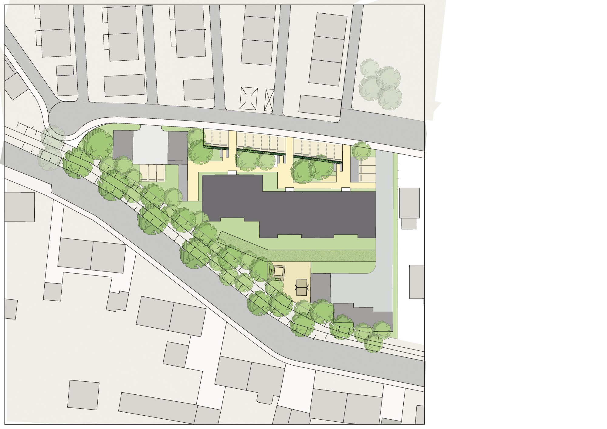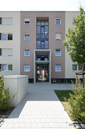 Die energetische Sanierung des Mehrfamilien-Wohnhauses aus den 70er Jahren stellt eine wesentliche räumliche und gestalterische Aufwertung des ganzen Stadtbereichs dar. Mit einer neuen Gestaltung der Fassade (WDVS) entsteht eine Gliederung und ein Rhythmus, der sich in den Außenanlagen fortsetzt. Neue Eingangsportale bilden einen neuen Maßstab und bieten dem Gebäude eine eindeutige und gut gestaltete Adresse.