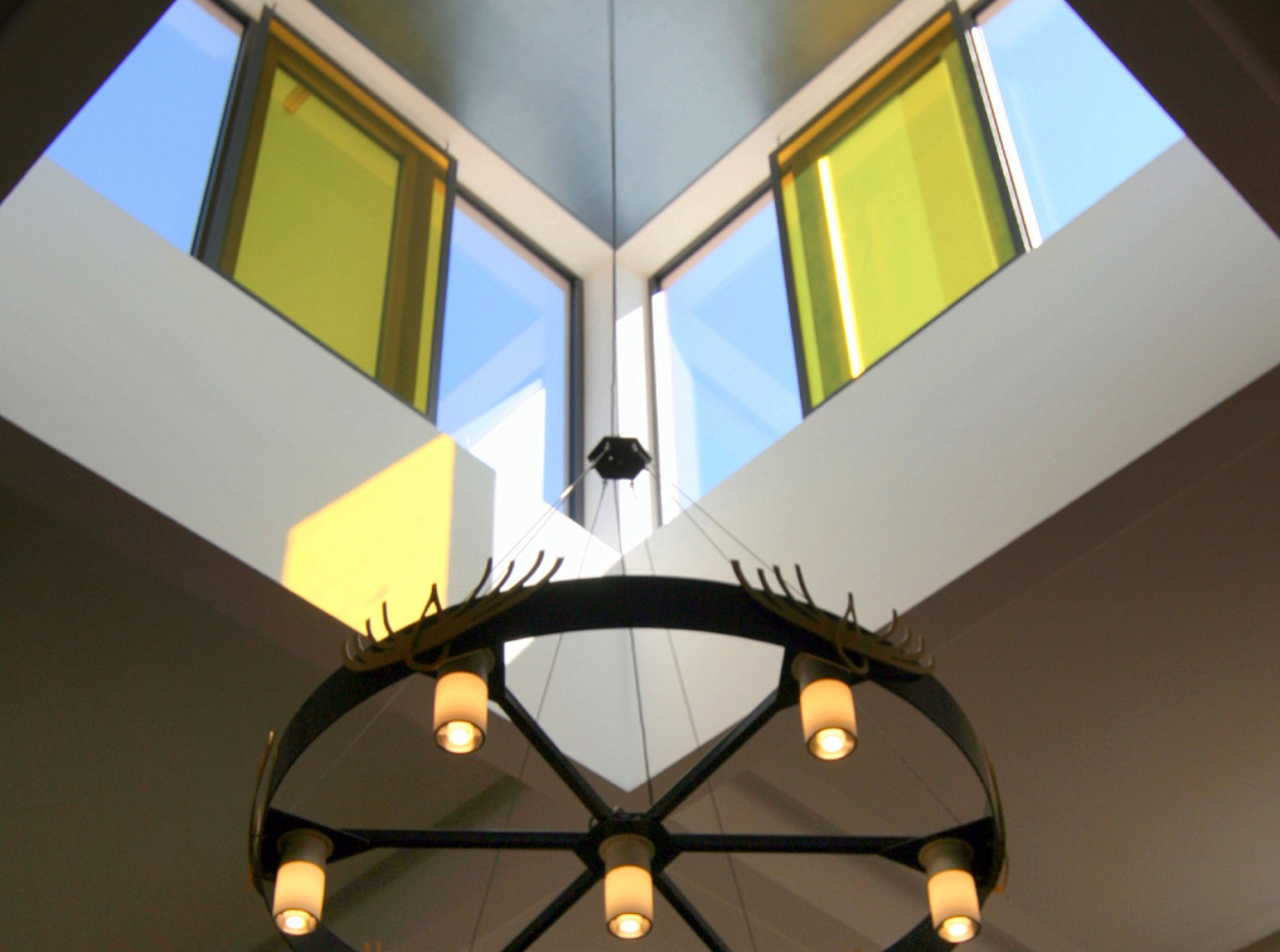 Wir wollten keine jüdische Architektur erfinden, sondern eine eigene, zeitgenössische Architektur mit jüdischen Bezügen generieren. Der Symbolwert dieser Synagoge bedeutete für uns Toleranz, Offenheit und Konzentration nach innen und außen. Wir haben den Ort und die Aufgabe mit einem würfelförmigen Kultbau belegt. Die Grundform des Quadrats soll als Integrität, der eingeschriebene Kreis der Frauenempore als die Unendlichkeit und der Kubus selbst als Autonomie verstanden werden. Der Kubus wird von einer zweiten Schale aus Sichtbetonscheiben umgeben. Diese Schale, einer Zwiebel vergleichbar, ist Schutzschild und Bedeutungsträger durch die angedeuteten jüdischen Symbole in geometrischen Spielformen des Davidsterns. Der Synagogenraum selbst ist als präziser Zentralraum entworfen worden. Der Almemor liegt in der Mitte, der Thoraschrein in einer mit Seitenlicht versehenen Ostnische und der Innenraum wird bekrönt von einem ebenfalls würfelförmigen, zenitalen Oberlicht. Die Frauenempore ist kreisrund mit einem offenen Teil nach Osten und verstärkt durch ihre Form das Zusammensein. Die segmentförmigen Bänke umgreifen den Almemor wie Hände einen Schatz.