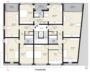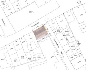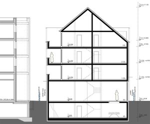 Der geplante Neubau nimmt das Thema des Zwerchgiebels des westlichen Hauses auf und interpretiert dies neu. Die Fassade ist in mineralischem Kratzputz, die Fenster in Eiche oder Holz/Alu, das Dach mit Ziegel oder Kupfer-/ Titanzinkblech wie im städtebaulichen Konzept vorgeschrieben angedacht. Ein Stadtbaustein muss entstehen, der die Gebäudefluchten komplettiert und sich optimal in den Straßenraum einfügt, gleichzeitig aber auch den Zugang zur Scheffelstraße öffnet.