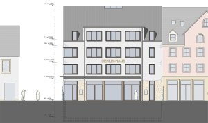 Das „UEHLIN-HAUS“ wird neu interpretiert. Die Architekturform generiert sich aus der Nachbarschaft und vor allem der notwendigen Platzwand. Das Haus muss sich in die Hauptstraße und im Gegenüber zum Rathaus im Weinbrennerstil einfügen.