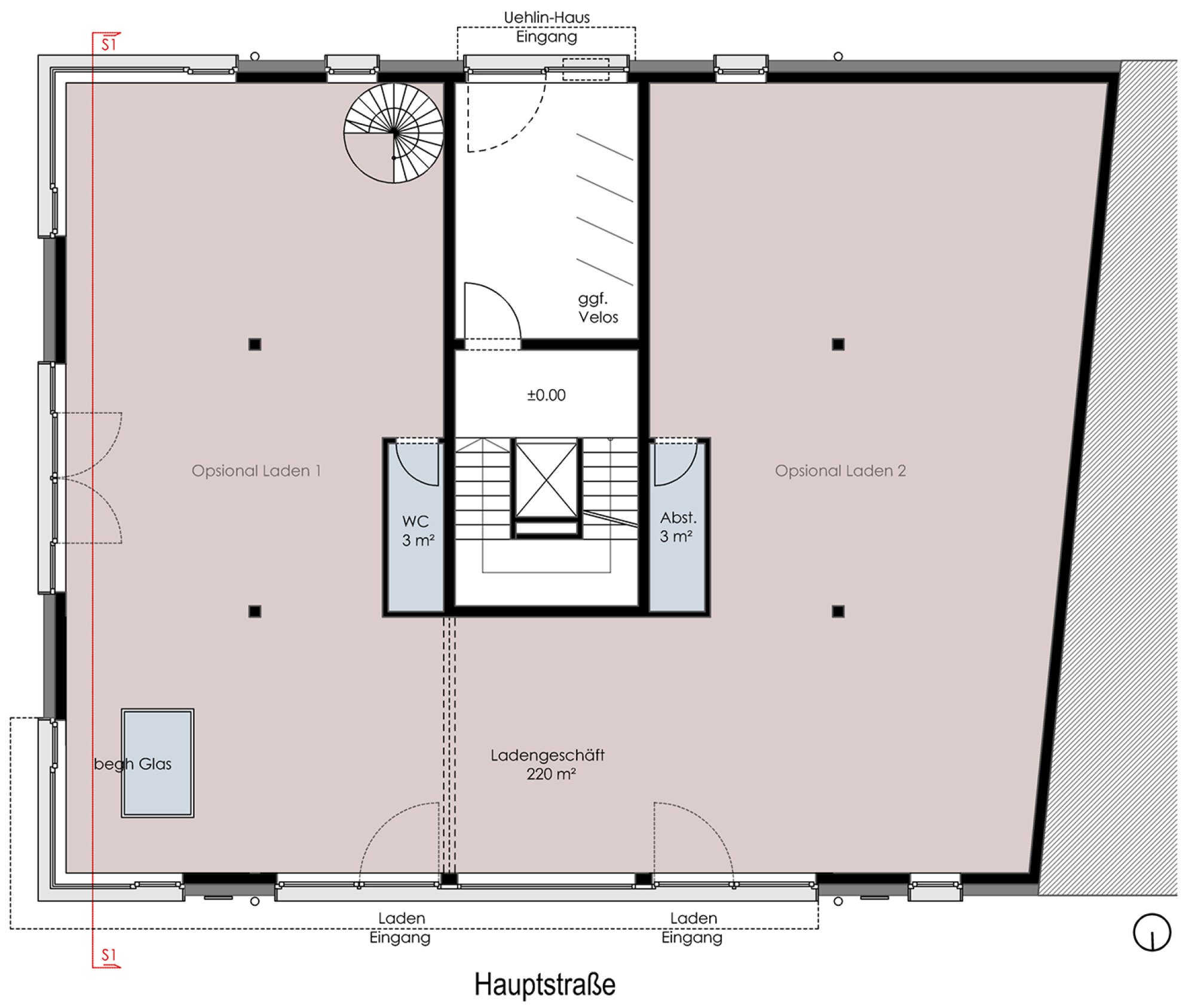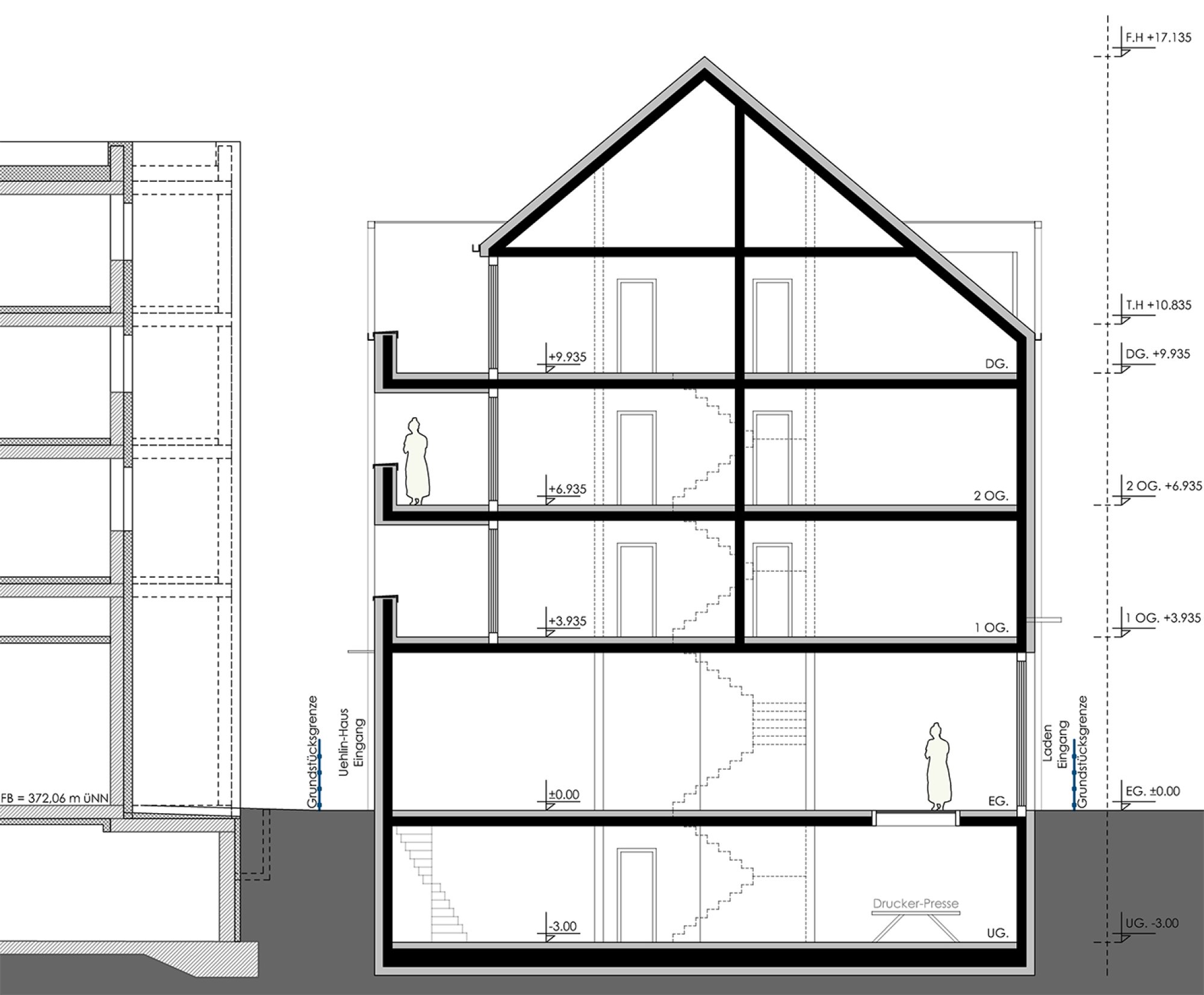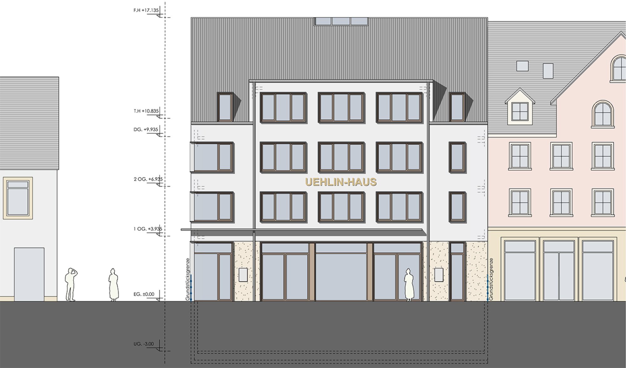 Das „UEHLIN-HAUS“ wird neu interpretiert. Die Architekturform generiert sich aus der Nachbarschaft und vor allem der notwendigen Platzwand. Das Haus muss sich in die Hauptstraße und im Gegenüber zum Rathaus im Weinbrennerstil einfügen.