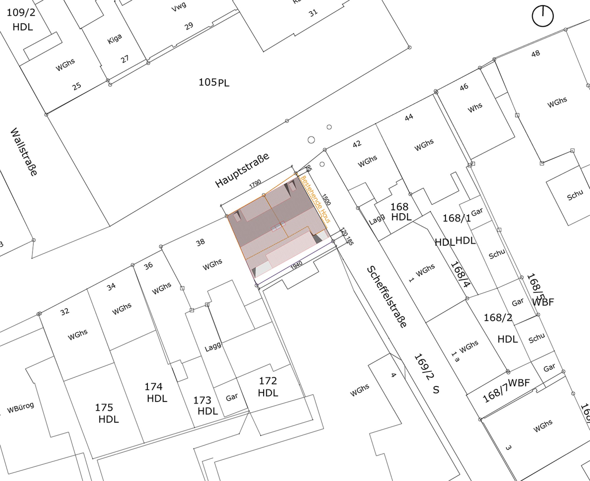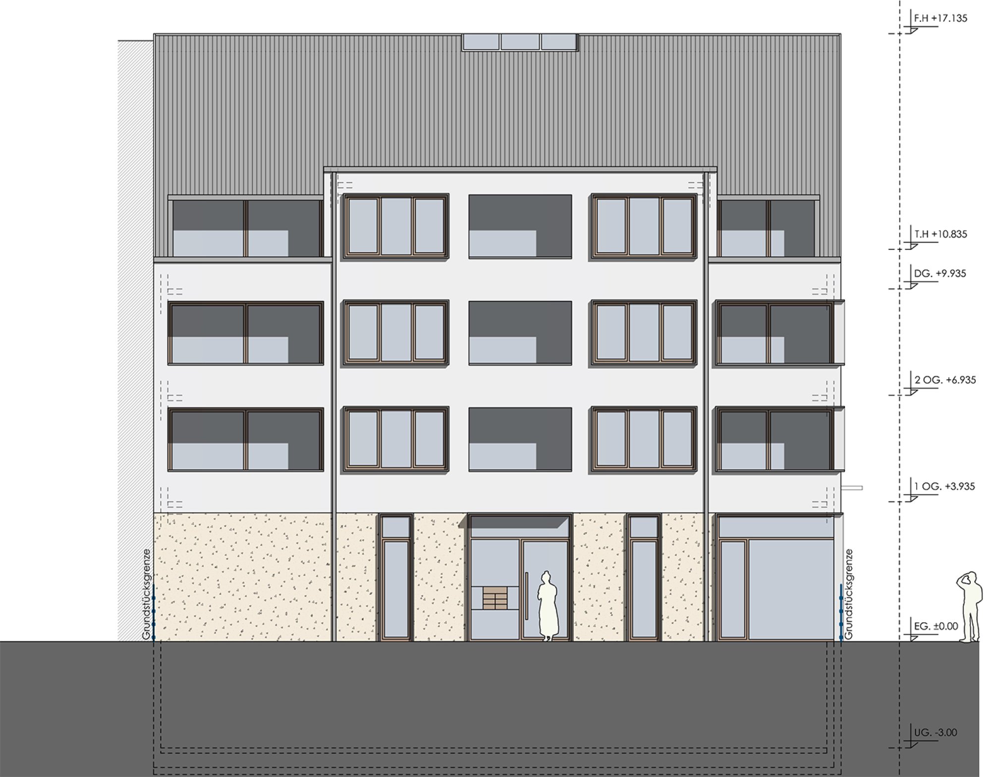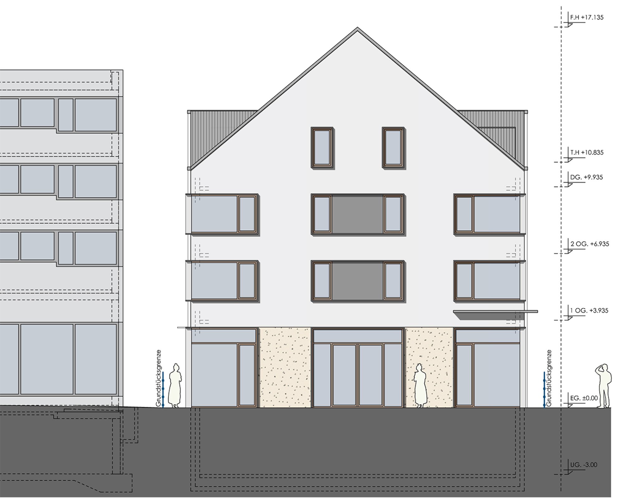 Der geplante Neubau nimmt das Thema des Zwerchgiebels des westlichen Hauses auf und interpretiert dies neu. Die Fassade ist in mineralischem Kratzputz, die Fenster in Eiche oder Holz/Alu, das Dach mit Ziegel oder Kupfer-/ Titanzinkblech wie im städtebaulichen Konzept vorgeschrieben angedacht. Ein Stadtbaustein muss entstehen, der die Gebäudefluchten komplettiert und sich optimal in den Straßenraum einfügt, gleichzeitig aber auch den Zugang zur Scheffelstraße öffnet.