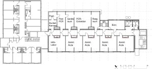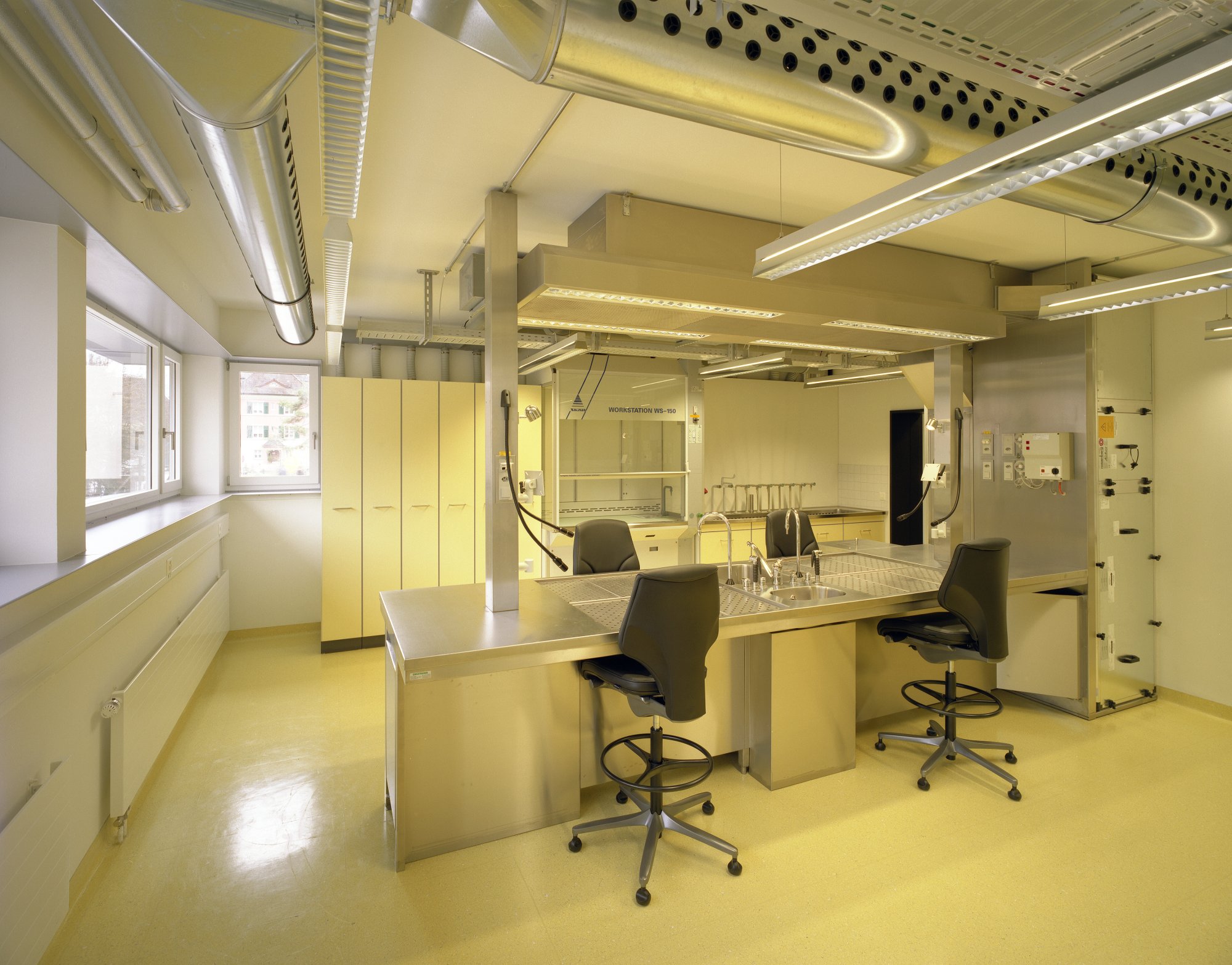 Es bildet den neuen Haupteingang zum Institut. Das Gebäude- und Haustechnikkonzept ist auf hohe Funktionalität bei möglichst einfacher und wirtschaftlicher Ausführung angelegt. Es entstehen moderne Labors, die allen Sicherheits- und Hygienevorschriften des Krankenhausbetriebes entsprechen.