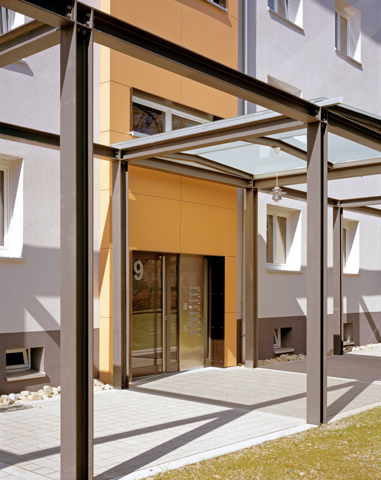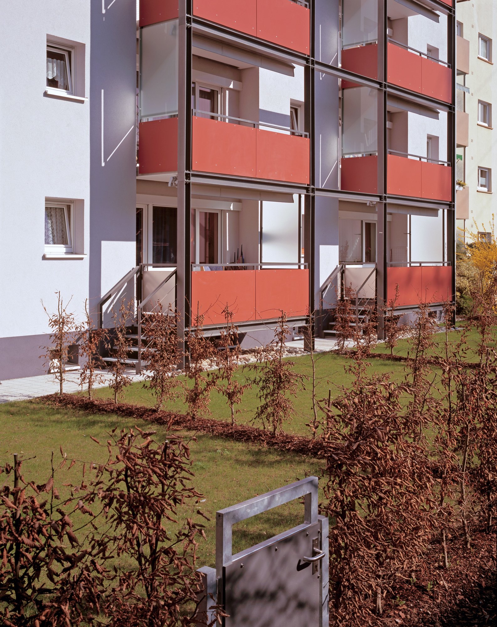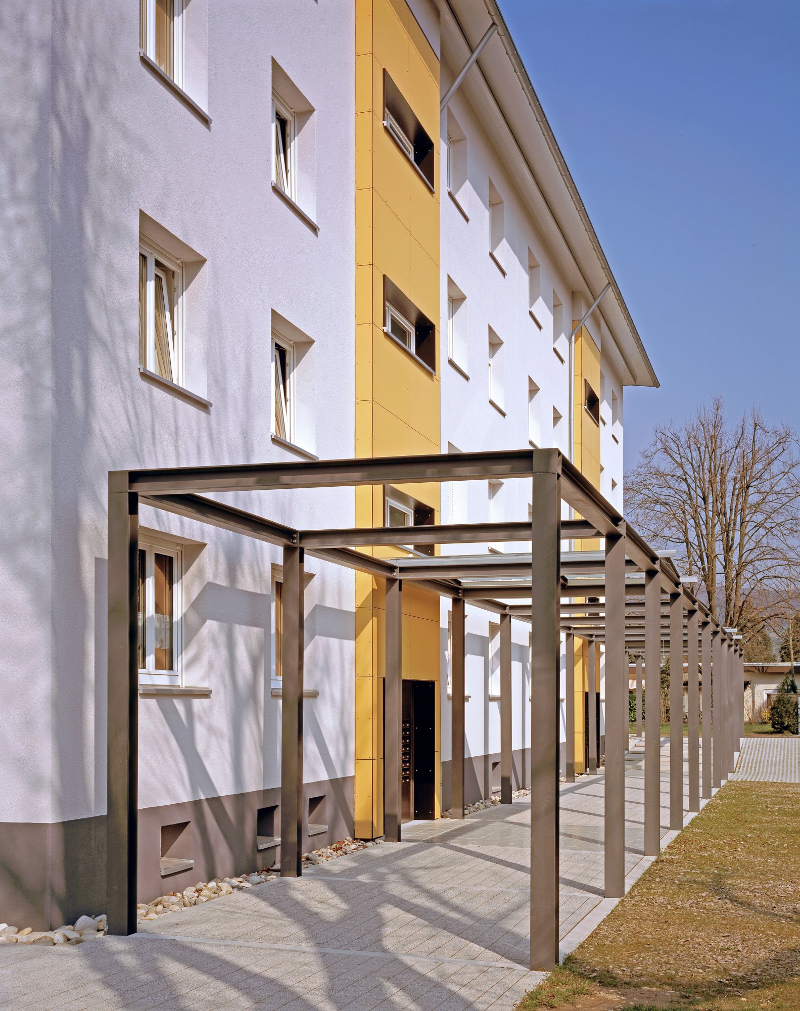 Die Architekten haben vorgeschlagen, den Charakter der 50er Jahre Bauten zu erhalten, aber einladende Zugänge, größere Balkone, bessere Außenraumnutzung und die detail-technische Gesamtheit der Bauten zu bearbeiten. Die energetische Sanierung der Bauten in der Austrasse wurde von der Bauherrschaft zum Anlass genommen ebenfalls funktionale und gestalterische Anlagen mit zu bearbeiten.Die Eingänge wurden aufgewertet und ebenso wie Fenster, Schiebeläden und alle Details in einem Material und Farbkonzept eingeordnet. Entscheidend war aber, daß der sympathische Quartierscharakter erhalten, gestalterisch aufgewertet und die Wohnqualität erhöht wurde und zusammen mit den Außenanlagen eine gute Adresse generiert wurde.