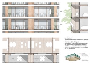 Die Gestaltung der Baukörper ist zur Straßenseite ruhig und horizontal gegliedert mit faktischer und optischer Widerstandsfähigkeit, um dem Straßenraum eine gewisse Kraft zu geben und um sich gegenüber dem Bertelsmann Bau zu behaupten .