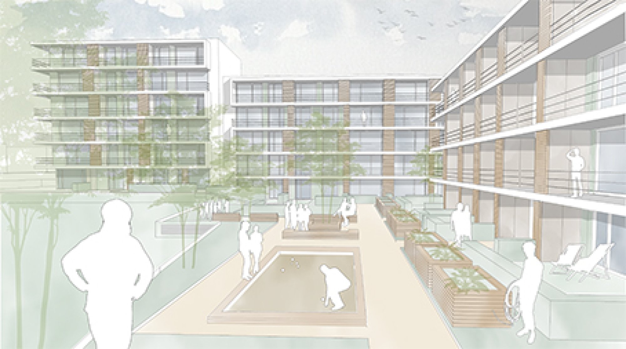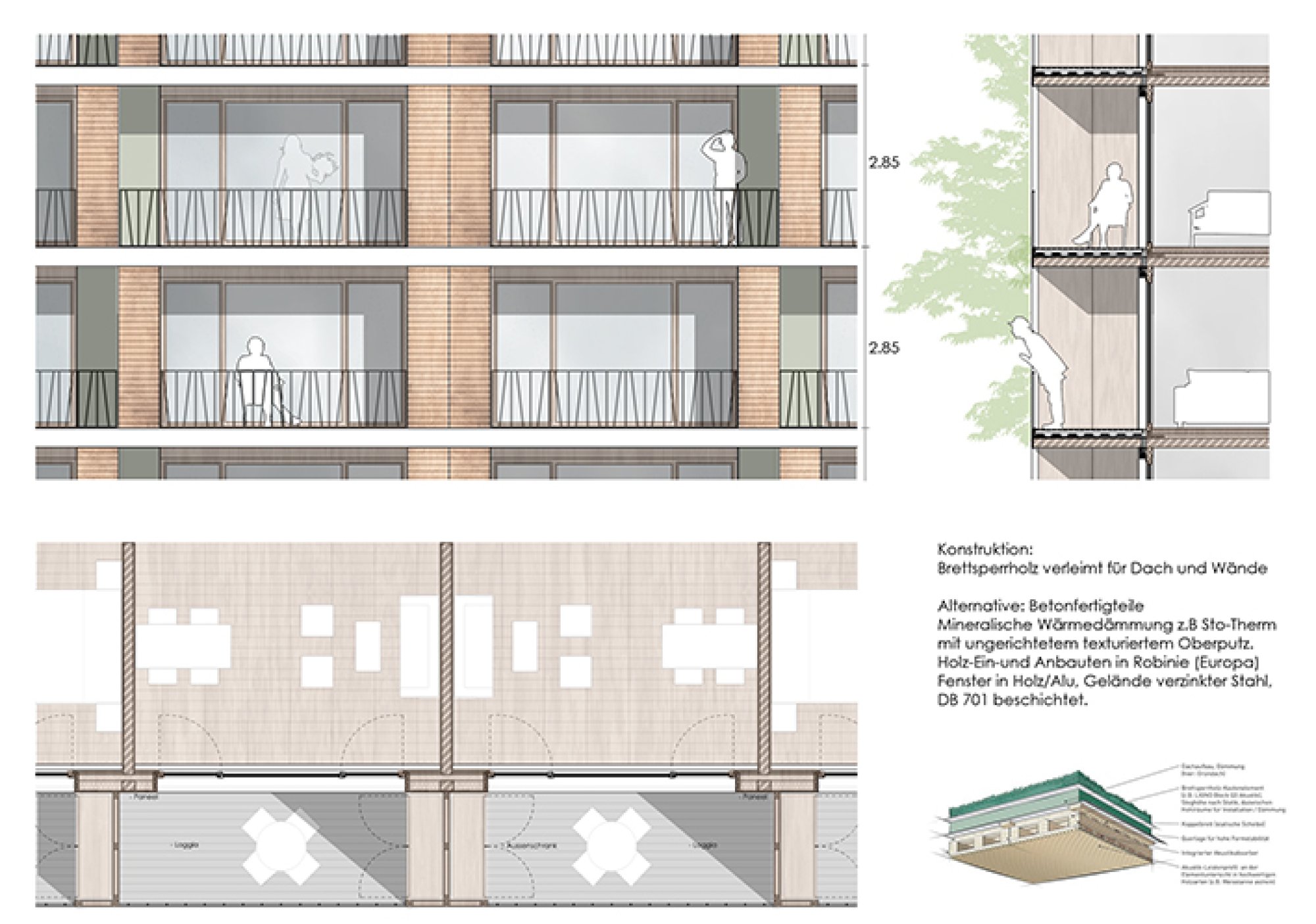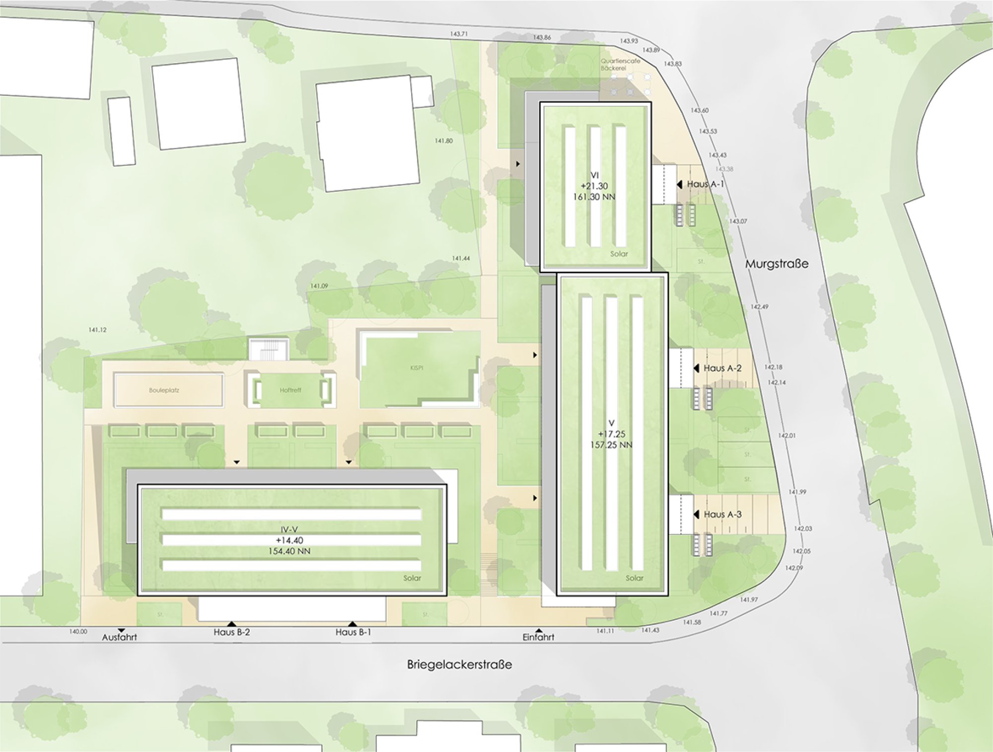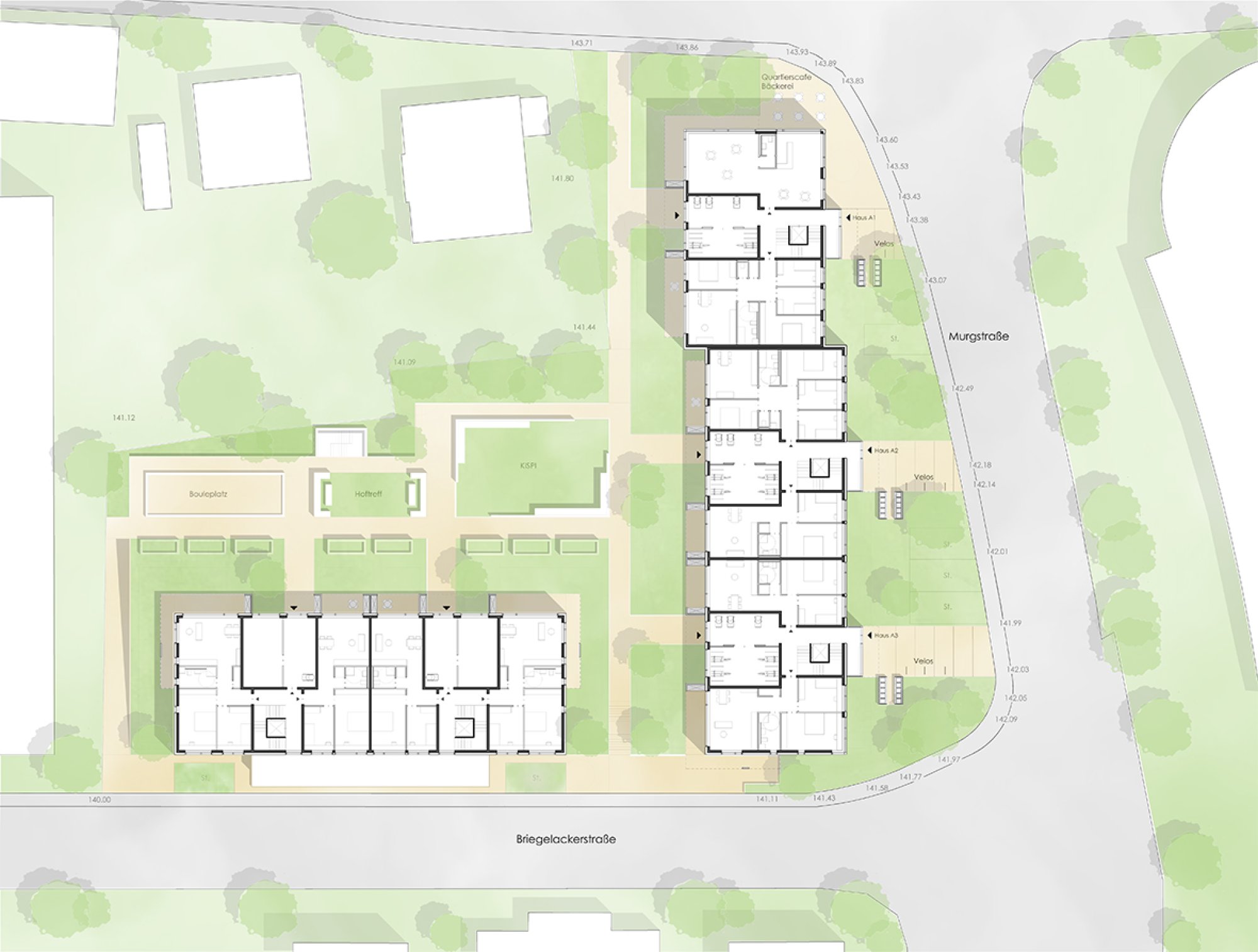 Zum Hof sind die Fassaden offen und „wohnlich“. Der Hof selbst wird begrünt, erhält Vorgärten vor den EG-Wohnungen und Kinderspielplatz, Bouleplatz, Quartierstreff und Hochbeete für gemeinschaftliches Gärtnern. Eine Durchwegung durch den halböffentlichen Hof ist geplant .