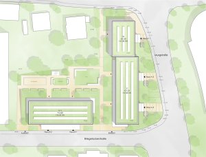 Die städtebauliche Setzung soll klare Straßenkanten, einen Hochpunkt an der Ecke Rheinstraße und Murgstraße als Pendant zum Bertelsmann Gebäude und Bildung eines ruhigen Innenhofs ermöglichen.
